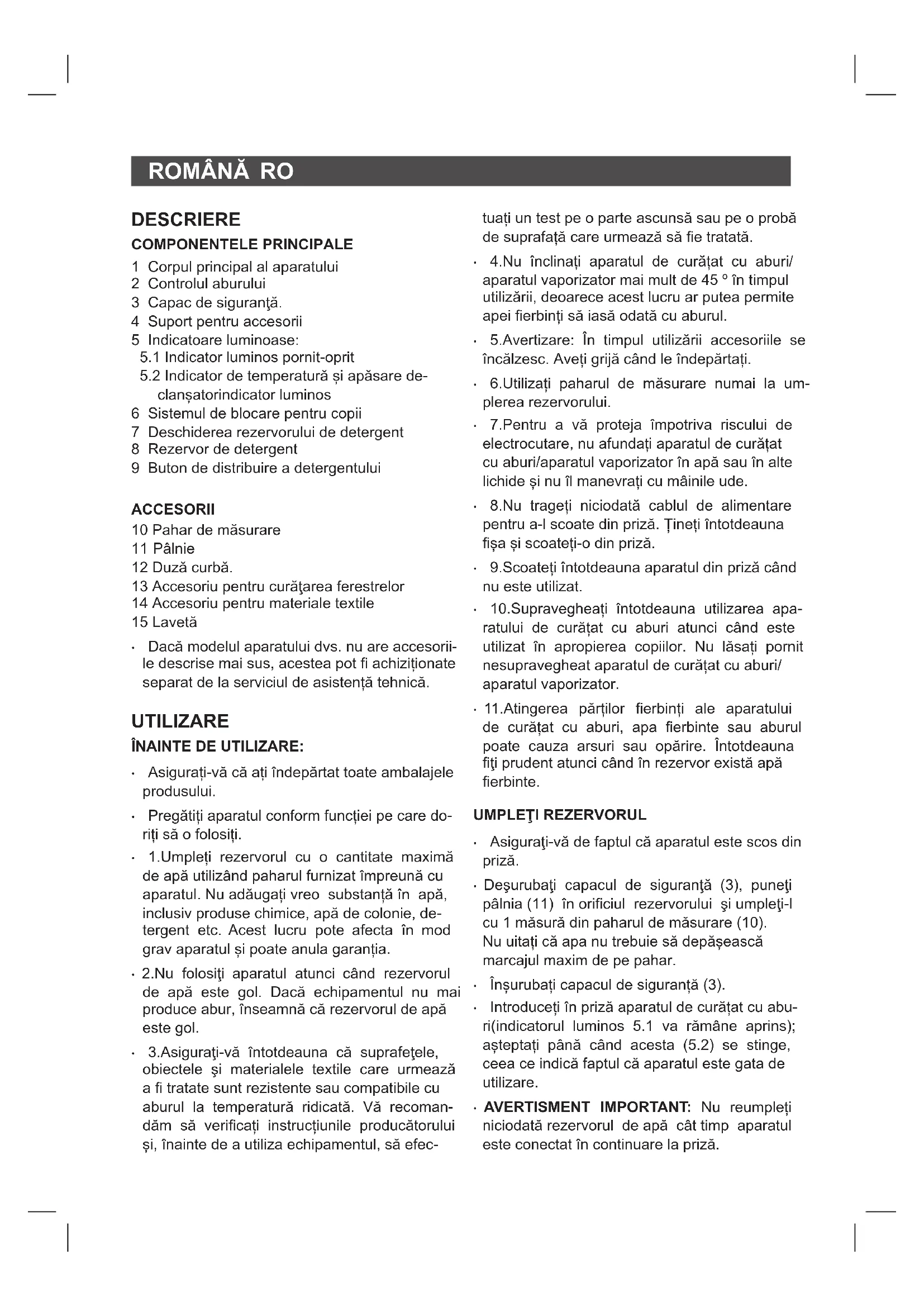 clanșatorindicator luminos 6 Sistemul de blocare pentru copii 7 Deschiderea rezervorului de detergent 8 Rezervor de detergent 9 Buton de distribuire a detergentului ACCESORII 10 Pahar de măsurare 11 Pâlnie 12 Duză curbă. 13 Accesoriu pentru curăţarea ferestrelor 14 Accesoriu pentru materiale textile 15 Lavetă