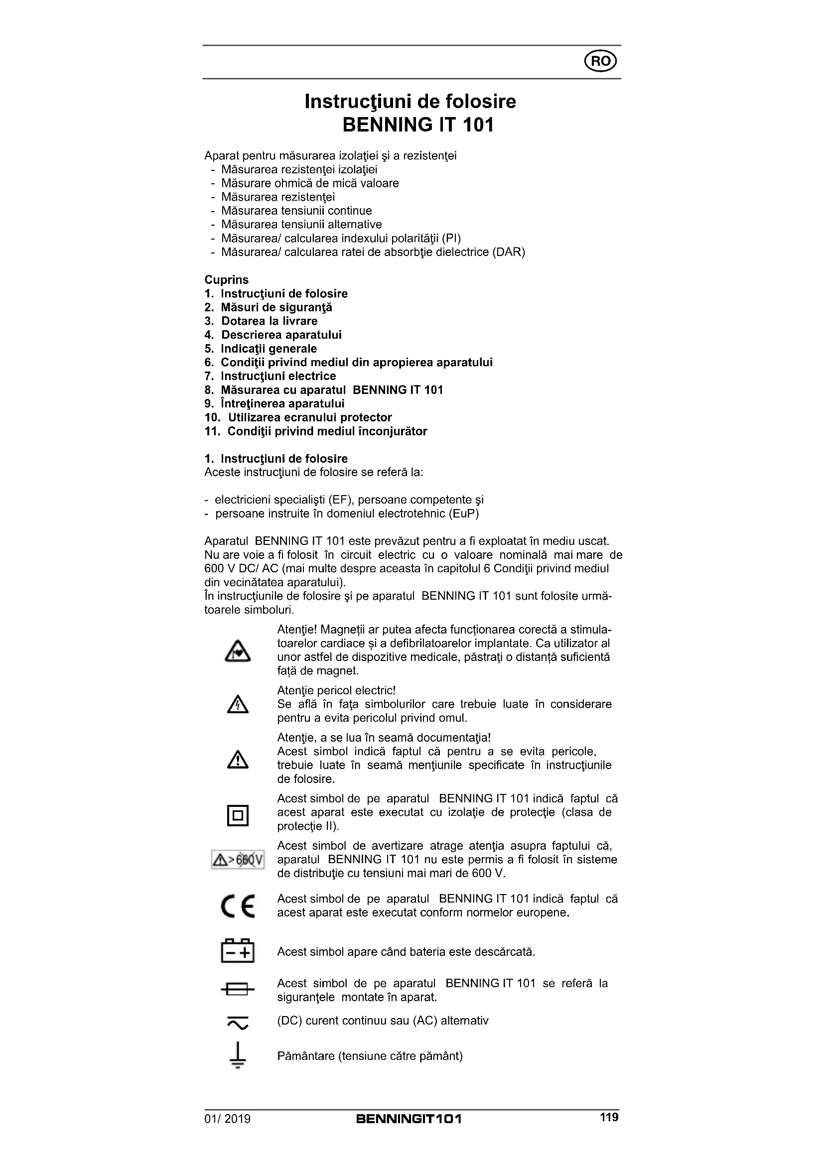 Instrucţiuni de folosire BENNING IT 101 Aparat pentru măsurarea izolaţiei şi a rezistenţei - Măsurarea rezistenţei izolaţiei - Măsurare ohmică de mică valoare - Măsurarea rezistenţei - Măsurarea tensiunii continue - Măsurarea tensiunii alternative - Măsurarea/ calcularea indexului polarităţii (PI) - Măsurarea/ calcularea ratei de absorbţie dielectrice (DAR) Cuprins
