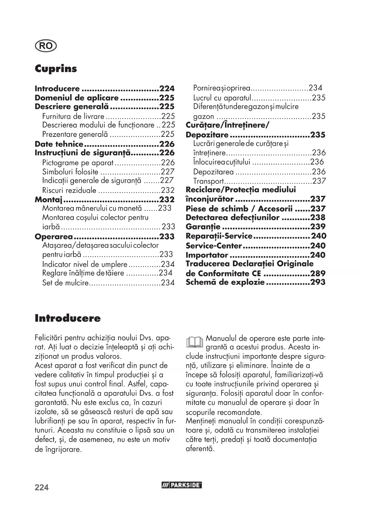 Service-Center ..........................240 Importator ...............................240 Manualul de operare este parte inte- grantă a acestui produs. Acesta in- clude instrucţiuni importante despre sigura- nţă, utilizare şi eliminare. Înainte de a începe să folosiţi aparatul, familiarizaţi-vă cu toate instrucţiunile privind operarea şi siguranţa. Folosiţi aparatul doar în confor- mitate cu manualul de operare şi doar în scopurile recomandate. Menţineţi manualul în condiţii corespunză- toare şi, odată cu transmiterea instalaţiei către terţi, predaţi şi toată documentaţia aferentă.225