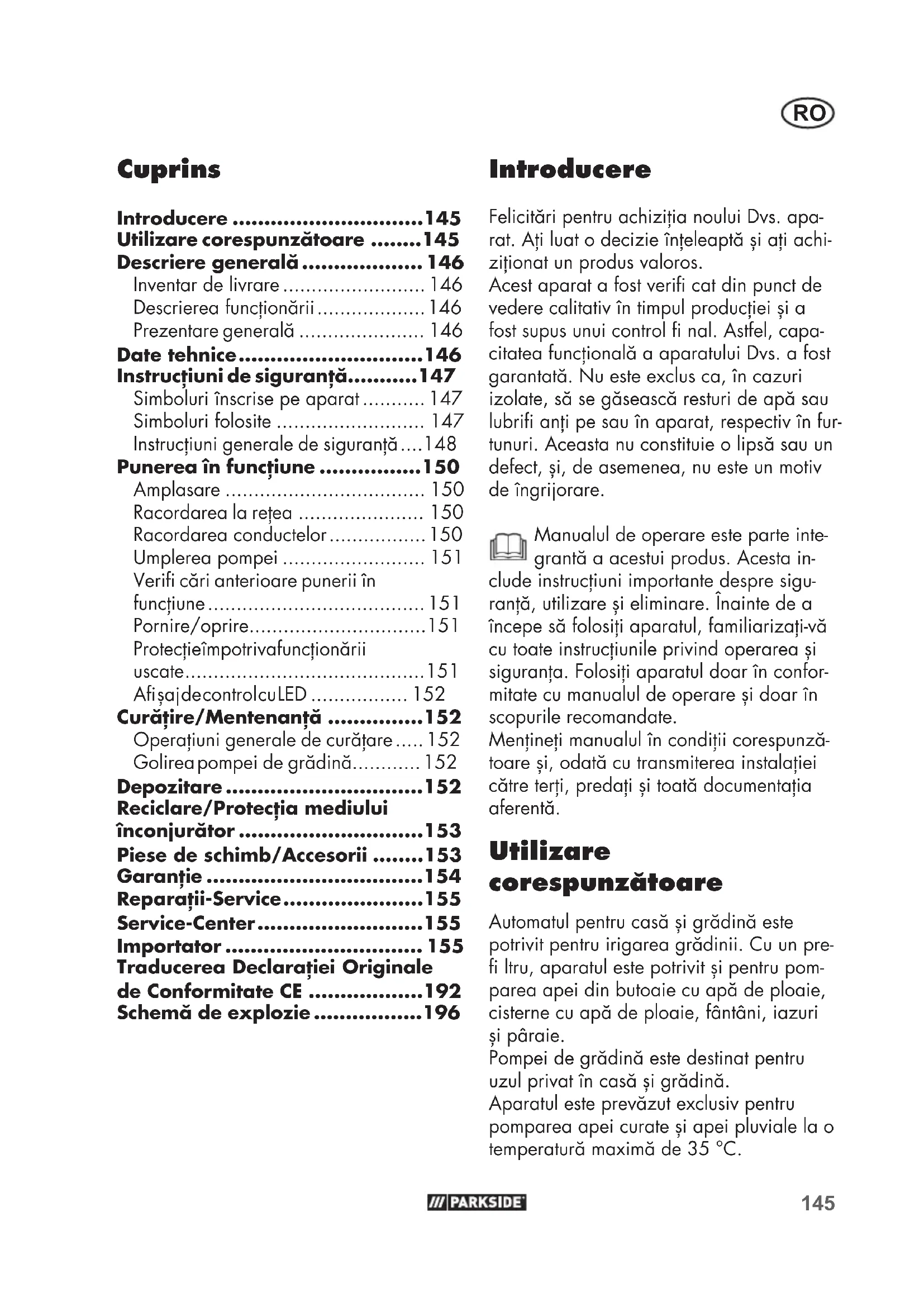 - Introducere Felicitări pentru achiziţia noului Dvs. apa- rat. Aţi luat o decizie înţeleaptă și aţi achi- ziţionat un produs valoros. Acest aparat a fost verifi cat din punct de vedere calitativ în timpul producţiei și a fost supus unui control fi nal. Astfel, capa- citatea funcţională a aparatului Dvs. a fost garantată. Nu este exclus ca, în cazuri izolate, să se găsească resturi de apă sau lubrifi anţi pe sau în aparat, respectiv în fur- tunuri. Aceasta nu constituie o lipsă sau un defect, și, de asemenea, nu este un motiv de îngrijorare. Manualul de operare este parte inte- grantă a acestui produs. Acesta in- clude instrucţiuni importante despre sigu- ranţă, utilizare și eliminare. Înainte de a începe să folosiţi aparatul, familiarizaţi-vă cu toate instrucţiunile privind operarea și siguranţa. Folosiţi aparatul doar în confor- mitate cu manualul de operare și doar în scopurile recomandate. Menţineţi manualul în condiţii corespunză- toare și, odată cu transmiterea instalaţiei către terţi, predaţi și toată documentaţia aferentă. Utilizare corespunzătoare Automatul pentru casă și grădină este potrivit pentru irigarea grădinii. Cu un pre- fi ltru, aparatul este potrivit și pentru pom- parea apei din butoaie cu apă de ploaie, cisterne cu apă de ploaie, fântâni, iazuri și pâraie. Pompei de grădină este destinat pentru uzul privat în casă și grădină. Aparatul este prevăzut exclusiv pentru pomparea apei curate și apei pluviale la o temperatură maximă de 35 °C. Cuprins Introducere p. 145