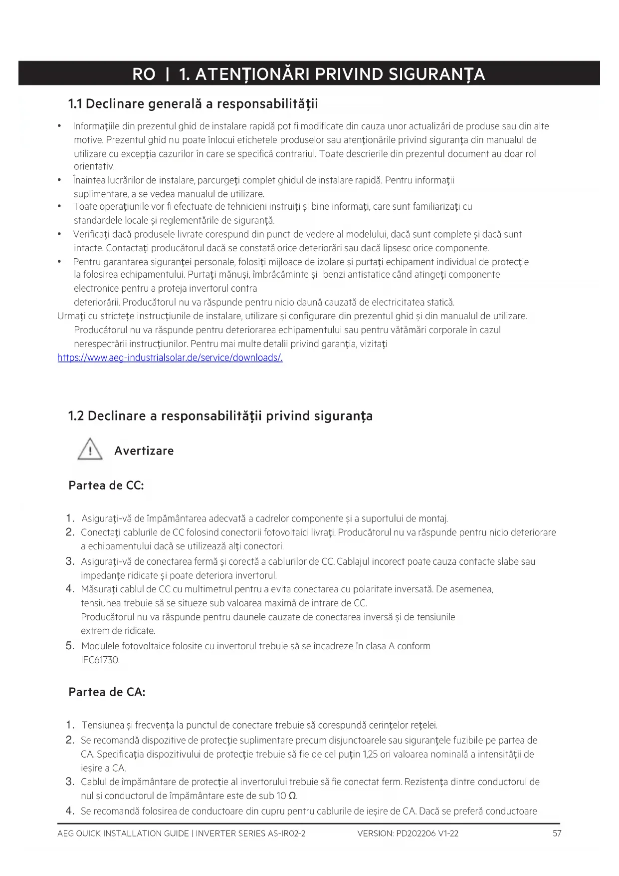 - Pentru garantarea siguranței personale, folosiți mijloace de izolare și purtați echipament individual de protecție la folosirea echipamentului. Purtați mănuși, îmbrăcăminte și benzi antistatice când atingeți componente electronice pentru a proteja invertorul contra deteriorării. Producătorul nu va răspunde pentru nicio daună cauzată de electricitatea statică. Urmați cu strictețe instrucțiunile de instalare, utilizare și configurare din prezentul ghid și din manualul de utilizare. Producătorul nu va răspunde pentru deteriorarea echipamentului sau pentru vătămări corporale în cazul nerespectării instrucțiunilor. Pentru mai multe detalii privind garanția, vizitați https://www.aeg-industrialsolar.de/service/downloads/.