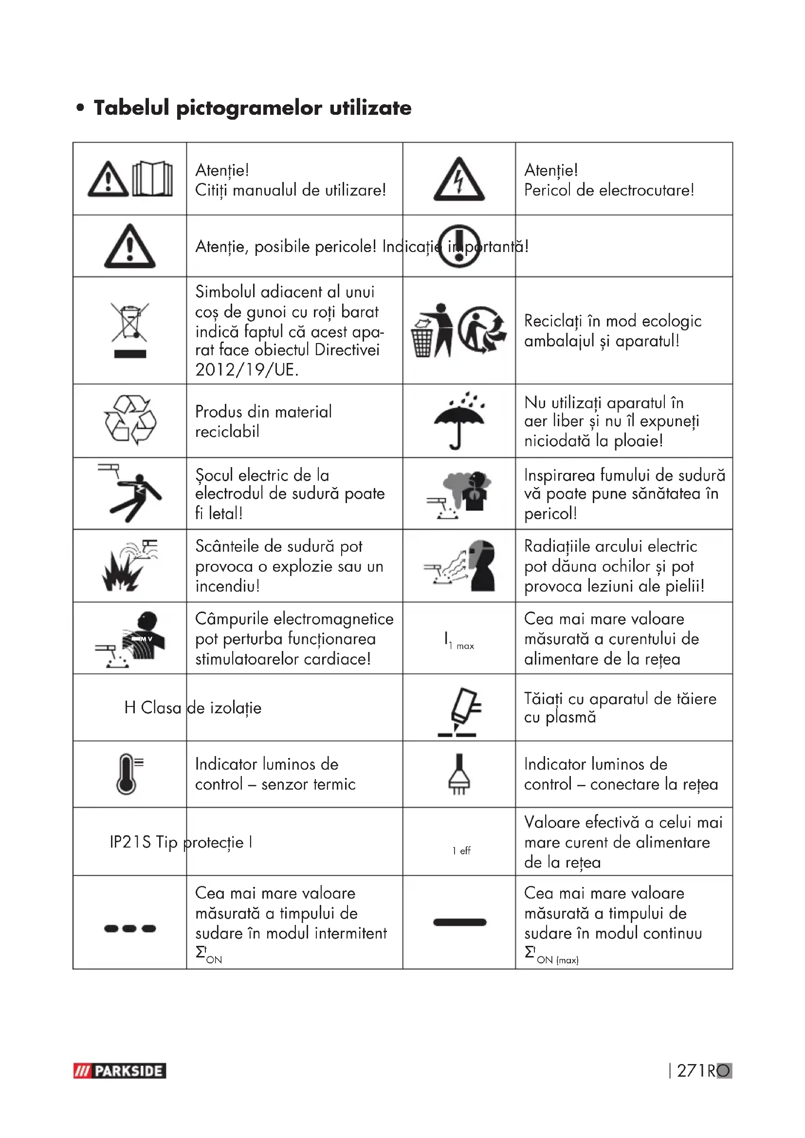 - Tabelul pictogramelor utilizate Atenție! Citiți manualul de utilizare! Atenție! Pericol de electrocutare! Atenție, posibile pericole! Indicație importantă! Simbolul adiacent al unui coș de gunoi cu roți barat indică faptul că acest apa- rat face obiectul Directivei 2012/19/UE. Reciclați în mod ecologic ambalajul și aparatul! Produs din material reciclabil Nu utilizați aparatul în aer liber și nu îl expuneți niciodată la ploaie! Șocul electric de la electrodul de sudură poate fi letal! Inspirarea fumului de sudură vă poate pune sănătatea în pericol! Scânteile de sudură pot provoca o explozie sau un incendiu! Radiațiile arcului electric pot dăuna ochilor și pot provoca leziuni ale pielii!
