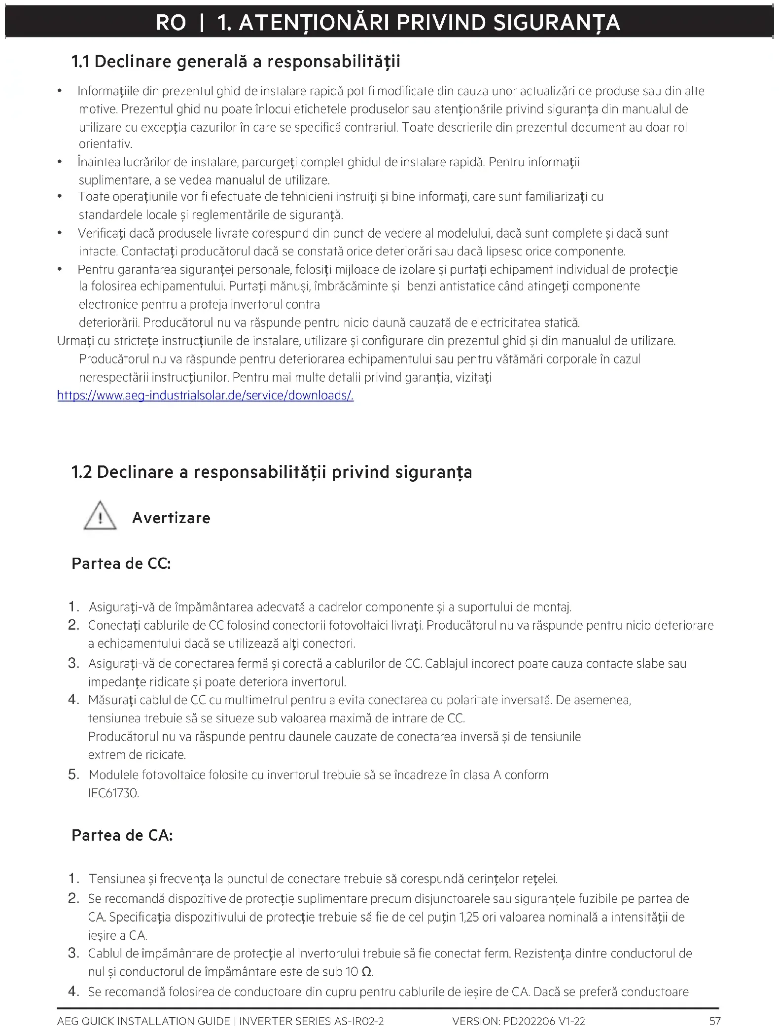 - Pentru garantarea siguranței personale, folosiți mijloace de izolare și purtați echipament individual de protecție la folosirea echipamentului. Purtați mănuși, îmbrăcăminte și benzi antistatice când atingeți componente electronice pentru a proteja invertorul contra deteriorării. Producătorul nu va răspunde pentru nicio daună cauzată de electricitatea statică. Urmați cu strictețe instrucțiunile de instalare, utilizare și configurare din prezentul ghid și din manualul de utilizare. Producătorul nu va răspunde pentru deteriorarea echipamentului sau pentru vătămări corporale în cazul nerespectării instrucțiunilor. Pentru mai multe detalii privind garanția, vizitați https://www.aeg-industrialsolar.de/service/downloads/.