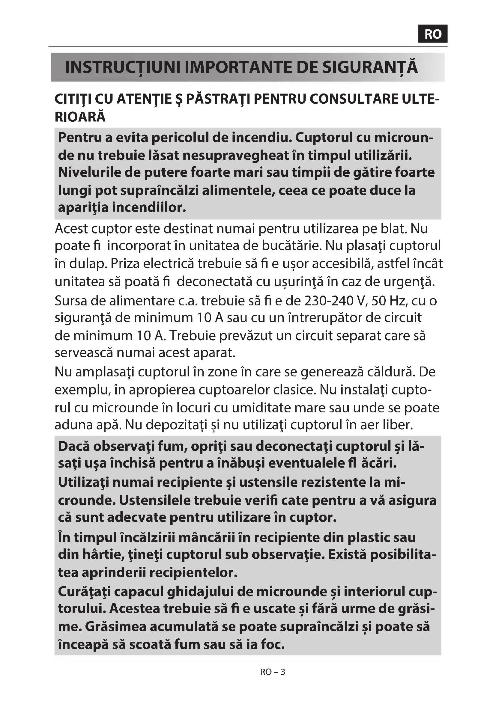 CITIȚI CU ATENȚIE Ș PĂSTRAȚI PENTRU CONSULTARE ULTE- RIOARĂ Pentru a evita pericolul de incendiu. Cuptorul cu microun- de nu trebuie lăsat nesupravegheat în timpul utilizării. Nivelurile de putere foarte mari sau timpii de gătire foarte lungi pot supraîncălzi alimentele, ceea ce poate duce la apariţia incendiilor. Acest cuptor este destinat numai pentru utilizarea pe blat. Nu poate incorporat în unitatea de bucătărie. Nu plasaţi cuptorul în dulap. Priza electrică trebuie să e ușor accesibilă, astfel încât unitatea să poată deconectată cu ușurinţă în caz de urgenţă. Sursa de alimentare c.a. trebuie să e de 230-240 V, 50 Hz, cu o siguranţă de minimum 10 A sau cu un întrerupător de circuit de minimum 10 A. Trebuie prevăzut un circuit separat care să servească numai acest aparat. Nu amplasaţi cuptorul în zone în care se generează căldură. De exemplu, în apropierea cuptoarelor clasice. Nu instalaţi cupto- rul cu microunde în locuri cu umiditate mare sau unde se poate aduna apă. Nu depozitaţi și nu utilizaţi cuptorul în aer liber. Dacă observaţi fum, opriţi sau deconectaţi cuptorul și lă- saţi ușa închisă pentru a înăbuși eventualele ăcări. Utilizaţi numai recipiente și ustensile rezistente la mi- crounde. Ustensilele trebuie veri cate pentru a vă asigura că sunt adecvate pentru utilizare în cuptor. În timpul încălzirii mâncării în recipiente din plastic sau din hârtie, ţineţi cuptorul sub observaţie. Există posibilita- tea aprinderii recipientelor. Curăţaţi capacul ghidajului de microunde și interiorul cup- torului. Acestea trebuie să e uscate și fără urme de grăsi- me. Grăsimea acumulată se poate supraîncălzi și poate să înceapă să scoată fum sau să ia foc.RO – 4RO – 4 Nu așezaţi materiale in amabile în apropierea cuptorului sau a ori ciilor pentru ventilare. Nu blocaţi ori ciile de ventilare. Îndepărtaţi de pe mâncare și de pe recipiente toate dispozitive- le de etanșare metalice, din sârmă etc. Arcul electric produs de suprafeţele metalice poate duce la producerea unui incendiu. Nu utilizaţi cuptorul cu microunde pentru a încălzi uleiul pen- tru prăjire în baie de ulei. Temperatura nu poate controlată și uleiul se poate aprinde. Pentru a prepara popcorn, utilizaţi numai pungi speciale pentru microunde. Nu depozitaţi alimente sau alte articole în interiorul cuptorului. După pornirea cuptorului, veri caţi setările pentru a vă asigura că acesta funcţionează corespunzător. Nu lăsați cuptorul nesupravegheat în timpul funcţionării. Pentru a evita supraîncălzirea și incendiile, trebuie avută o aten- ţie deosebită când gătiți sau reîncălziți alimente cu un conţinut ridicat de zahăr sau grăsimi, de exemplu, cârnaţi, plăcinte sau budinci. Consultaţi sfaturile aferente din manualul de utilizare. Pentru a evita producerea leziunilor. AVERTISMENT: Nu utilizați cuptorul dacă este avariat sau funcționează neco- respunzător. Înainte de utilizare, efectuați următoarele veri - cări: a) Asigurați-vă că ușa se închide corespunzător și nu este închisă incorect sau deformată. b) Asigurați-vă că balamalele și închiderile de siguranță ale ușii nu sunt rupte sau slăbite. c) Asigurați-vă că garniturile și suprafețele de etanșare ale ușii nu prezintă urme de deteriorare. d) Asigurați-vă că interiorul cuptorului sau ușa nu prezintă ciobituri. e) Asigurați-vă că ștecherul și cablul de alimentare nu au fost deteriorate. În cazul deteriorării ușii sau a garniturilor de etanșare ale ușii, RO – 5RO RO – 4 RO – 5RO – 5 cuptorul nu trebuie utilizat înainte de a reparat de către o persoană specializată. Nu reglați, reparaţi sau modi caţi singuri cuptorul. Este periculos ca altcineva în afară de persoanele competente să realizeze lucrări de service sau reparaţii care necesită îndepărtarea carcasei de protecţie împotriva expunerii la energia microundelor. Nu utilizați cuptorul cu ușa deschisă și nu realizați niciun fel de modi cări asupra închiderilor de siguranță ale ușii. Nu utilizați cuptorul dacă există un obiect între garniturile ușii și suprafețe- le de etanșare. Nu lăsați să se acumuleze grăsime sau mizerie pe garnitu- rile ușii sau în zonele din jurul acesteia. Curățați cuptorul în mod regulat și îndepărtați orice urme de mâncare. Respectați instrucțiunile de „Curățare și întreținere”. Ne- respectarea instrucțiunilor de curățare a cuptorului poate duce la deteriorarea suprafeței acestuia, care poate afecta durata de viață a aparatului și genera chiar situații posibil periculoase. Persoanele cu stimulatoare cardiace trebuie să consulte un medic sau producătorul stimulatorului în cazul în care intenţio- nează să utilizeze cuptorul cu microunde. Pentru a evita posibilitatea de electrocutare.