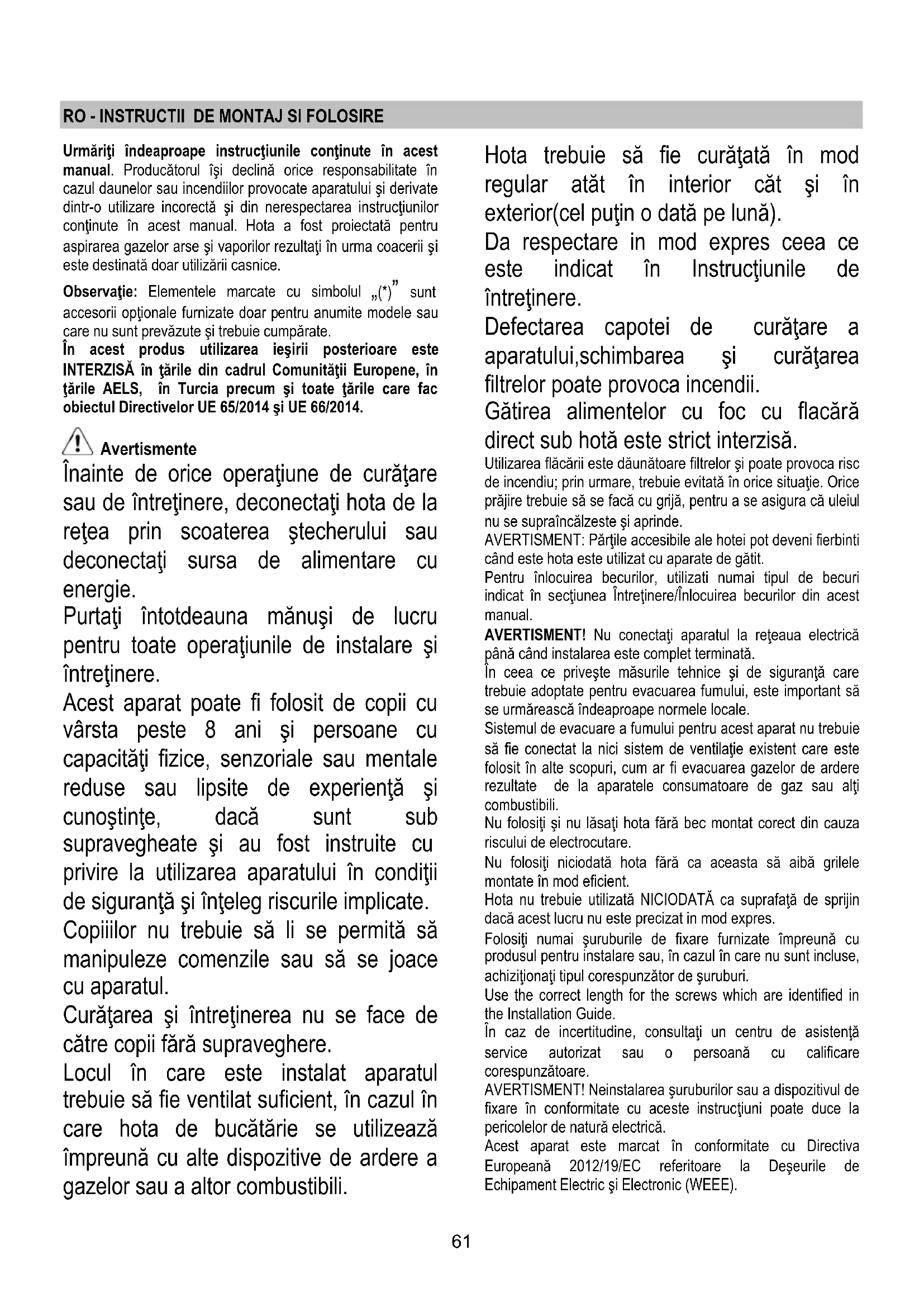 - EMC: EN 55014-1; CISPR 14-1; EN 55014-2; CISPR 14-2; EN/IEC 61000-3-2; EN/IEC 61000-3-3. Recomandări pentru o utilizare corespunzătoare în scopul reducerii impactului asupra mediului: Când începeţi să gătiţi, porniţi hota la viteză minimă şi lăsaţi-o să funcţioneze timp câteva minute după ce aţi terminat de gătit. Mă riţi viteza în cazul cantităţilor mari de fum sau vapori şi utilizaţi viteza/ele sporită/e doar în cazuri extreme. Înlocuiţi filtrul/ele de carbon, atunci când este necesar, pentru a menţine o eficienţă optimă de reducere a mirosului. Curăţaţi filtrul/ele de grăsime, atunci când este necesar, pentru a menţine o eficienţă optimă a filtrului. Utilizaţi diametrul maxim al sistemului de conducte indicat în acest manual pentru a optimiza eficienţa şi pentru a reduce la minimum nivelul de zgomot. Utilizarea Hota a fost realizată pentru a fi utilizată în versiunea aspirantă cu evacuare externă sau în versiunea filtrantă cu riciclu intern. Varianta aspirantă Capa este dotata cu o iesire de aer superiora B1 si optional si de o iesire posterioara B2* , in vederea evacuarii fumului catre exterior. Alegeti iesirea cea mai convenabila si aplicati mansonul C din dotare, inchideti complet gaura nefolosita cu dopul D* din dotare daca este prevazut. Notă: la unele modele orificiul superior B1 este furnizat închis: Apăsaţi cu decizie pentru a scoate partea pre- fracturată care închide orificiul de evacuare şi scoateţi-o. Atenţie! partea pre-fracturată nu mai poate fi remontată la locul ei, executaţi această operaţiune numai dacă sunteţi siguri că acest tip de instalaţie trebuie executat. Atentie! La unele modele gaura de iesire superiora nu este imediat accesibila, chiar daca se scoate dopul (daca e deja montat), in acest caz scoateti bucata de plastic E1 si E2 care obstrueaza gaura dand-o jos, ajutandu-va de o penseta si de un ustensil de taiat hartia. Asigurati-va ca selectorul aspiratie/filtrare (din interiorul capei) G este in pozitia aspirare (A). Obtočna različica In cazul in care nu este posibila evacuarea catre exterior a fumului si vaporilor rezultati in urma gatirii se poate folosi capa in versiune filtrare montand un filtru de carbon, fumul si vaporii fiind reciclati prin grilajul anterior situat deasupra panoului de unde se actioneaza comenzile. Asigurati-va ca selectorul aspiratie/filtrare (din interiorul capei) G este in pozitia filtrare (F). Modelele care nu sunt prevăzute cu motor de aspirare, funcţionează numai în versiune aspirant ă şi trebuie conectate la o unitate periferică de aspirare (care nu este în dotare). Instrucţiunile pentru sistemul de racordare sunt furnizate cu unitatea periferică de aspirare. Instalarea Distanţa minimă între suprafaţa suportului recipientelor pe dispozitivul de gătit şi partea de jos a hotei nu trebuie să fie mai mică de 60cm în cazul maşinilor de gătit electrice, şi de 75cm în cazul maşinilor de gătit cu gaz sau mixte. Dacă instrucţiiunile dispozitivului de gătit cu gaz specifică o distanţă mai mare, este necesar să ţineţi cont de aceasta. Conexarea Electrică Tensiunea din reţea trebuie să corespundă cu tensiunea la care se referă eticheta situată în interiorul hotei. Dacă este prevăzută cu ştecher conectaţi hota la o priză conform cu normele în vigoare, poziţionată într-o zona accesibilă şi după instalare. Dacă nu este prevăzută cu ştecher (conexiunea este direct la reţea) sau ştecherul nu este poziţionat într-o zonă accesibilă şi după instalare, aplicaţi un întrerupător bipolar la normă care să asigure deconectarea completă de la reţea în condiţiile categoriei de supratensiune III, conform regulilor de instalare. Atenţie! înainte de a efectua conectarea circuitului hotei la alimentaţia din reţea şi de a verifica funcţionarea corectă, controlaţi totdeauna dacă cablul a fost montat în mod corect. Atenţie! înlocuirea cablului de alimentare trebuie s ă fie efectuată numai de către serviciul de asistenţă tehnică autorizat în aşa fel încât să poată preveni orice risc. Montarea Capa poate fi instalata pe perete sau pe o suprafata suspendata; daca se afla in dotare folositi mulajul H pentru a putea face gaurile la distanta exacta, daca nu, sprijiniti capa de perete sau pe supratata suspendata si desenati cu creionul gaurile ce trebuiesc executate. Fixarea la perete – Introduceti diblurile de perete J in gaurile executate si doua suruburi K in gaurile superiore, scoateti grilajul si agatati capa de cele doua suruburi, in sfarsit, din63 interior introduceti cel de al treilea surub L si strangeti toate suruburile. Fixarea pe suprafata suspendata – Fixati capa cu 4 suruburi M din interiorul suprafetei suspendate. Funcţionarea Hota este dotată cu un panou de comandă, de la care se modifică viteza de aspiraţie şi se declanşează aprinderea becurilor pentru iluminarea blatului de aragaz. Deschideti mereu captatorul de vapori N*. Dacă modelul dvs. este prevăzut de supapă cu acţiune electrică sau mecanică, tastele şi/sau butoanele, şi/sau manetele care sunt la dispoziţie, se vor folosi numai pentru controlarea luminilor şi pentru deschiderea sau închiderea supapei. Întreţinerea Curăţarea Pentru curăţare folosiţi EXCLUSIV un material îmbibat cu detergenţi lichizi neutri. NU UTILIZAȚI UNELTE SAU INSTRUMENTE PENTRU CURĂȚARE! Evitaţi folosirea produselor pe bază de abrazivi NU FOLOSIŢI ALCOOL! Filtru anti-grăsimi Captează particulele de grăsime care apar în timpul pregătirii alimentelor. Dacă este amplasat în interiorul unui grătar de susţinere, acesta poate fi: un filtru de hârtie: trebuie să fie înlocuit o dată pe lună sau, dacă este colorat pe faţa superioară, atunci când culoarea se vede prin orificiile grătarului. un filtru metalic: trebuie să fie spălat o dată pe lună, cu detergenţi neagresivi, cu mâna sau în maşina 