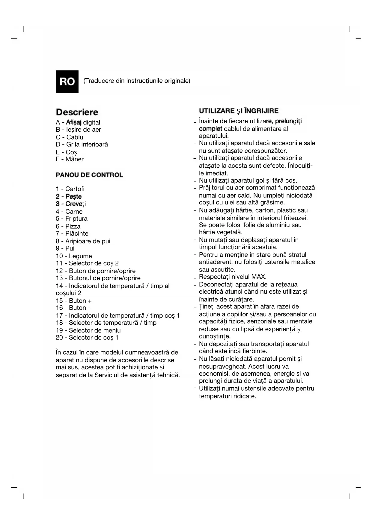 (Traducere din instrucțiunile originale) Descriere A - Afișaj digital B - Ieșire de aer C - Cablu D - Grila interioară E - Coș F - Mâner