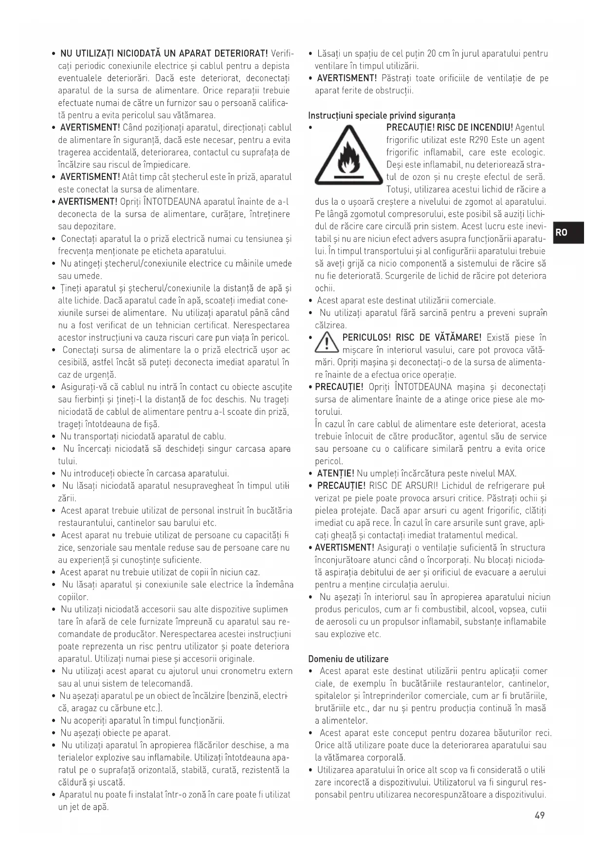PRECAUȚIE! RISC DE INCENDIU! Agentul frigorific utilizat este R290 Este un agent frigorific inflamabil, care este ecologic. Deși este inflamabil, nu deteriorează stra