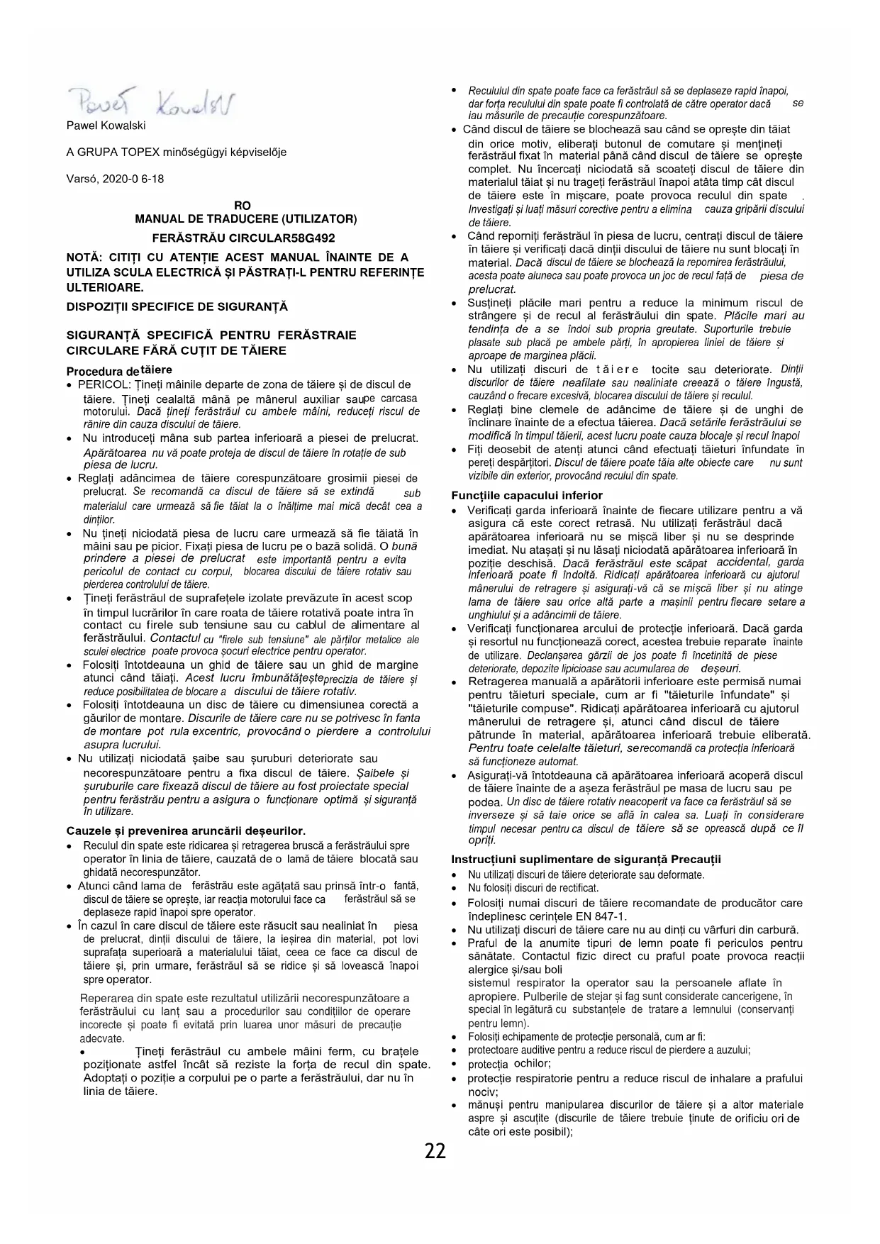 Produsele cu alimentare electrică nu trebuie aruncate împreună cu deșeurile menajere, ci trebuie duse la instalații adecvate pentru a fi eliminate. Contactați distribuitorul produsului sau autoritatea locală pentru informații privind eliminarea. Deșeurile de echipamente electrice și electronice conțin substanțe care nu sunt ecologice. Echipamentele care nu sunt reciclate prezintă un risc potențial pentru mediu și sănătatea umană. "Grupa Topex Spółka z ograniczoną odpowiedzialnością" Spółka komandytowa cu sediul social în Varșovia, ul. Pograniczna 2/4 (denumită în continuare: "Grupa Topex") informează că toate drepturile de autor asupra conținutului acestui manual (denumit în continuare: "Manualul"), inclusiv, printre altele. textul său, fotografiile, diagramele, desenele, precum și compoziția sa, aparțin exclusiv Grupa Topex și fac obiectul protecției juridice în temeiul Legii din 4 februarie 1994 privind drepturile de autor și drepturile conexe (adică Jurnalul Oficial 2006 nr. 90 Poz. 631, cu modificările ulterioare). Copierea, prelucrarea, publicarea, modificarea în scopuri comerciale a întregului Manual și a elementelor sale individuale, fără acordul Grupa Topex exprimat în scris, este strict interzisă și poate atrage răspunderea civilă și penală. Declarația de conformitate CE Producător: Grupa Topex Sp. Z o.o. Sp.k., Pograniczna 2/4 02-285 Varșovia Produs: Ferăstrău circular Nr. produs: 58G492 Denumire comercială: GRAFIT Număr de ordine: 00001 ÷ 99999 Această declarație de conformitate este emisă pe răspunderea exclusivă a producătorului. Produsul descris mai sus respectă următoarele documente: Directiva 2006/42/CE privind echipamentele tehnice Directiva 2014/30/UE privind compatibilitatea electromagnetică Directiva RoHS 2011/65/UE, astfel cum a fost modificată prin Directiva 2015/863/UE Și îndeplinește cerințele următoarelor standarde: EN 62841-1:2015; EN 62841-2-5:2014; EN 55014-1:2017; EN 55014-2:2015; EN IEC 61000-3-2:2019; EN 61000-3-3:2013+A1; IEC 62321-3-1:2013; IEC 62321-4:2013+AMD1:2017; IEC 62321- 5:2013; IEC 62321-6:2015; IEC 62321-7-1:2015; IEC 62321-7-2:2017; IEC 62321-8:2017 Această declarație se referă numai la echipamentul în starea în care a fost introdus pe piață și nu acoperă componentele adăugate de utilizatorul final sau acțiunile ulterioare efectuate de utilizatorul final. Numele și adresa persoanei rezidente sau stabilite în UE autorizate să pregătească documentația tehnică: Semnat în numele: Grupa Topex Sp. Z o.o. Sp.k. Stup. Borderland 2 /4 02-285 Varșovia Pawel Kowalski Reprezentant calitate GRUPA TOPEX Varșovia, 2020-0 6-18