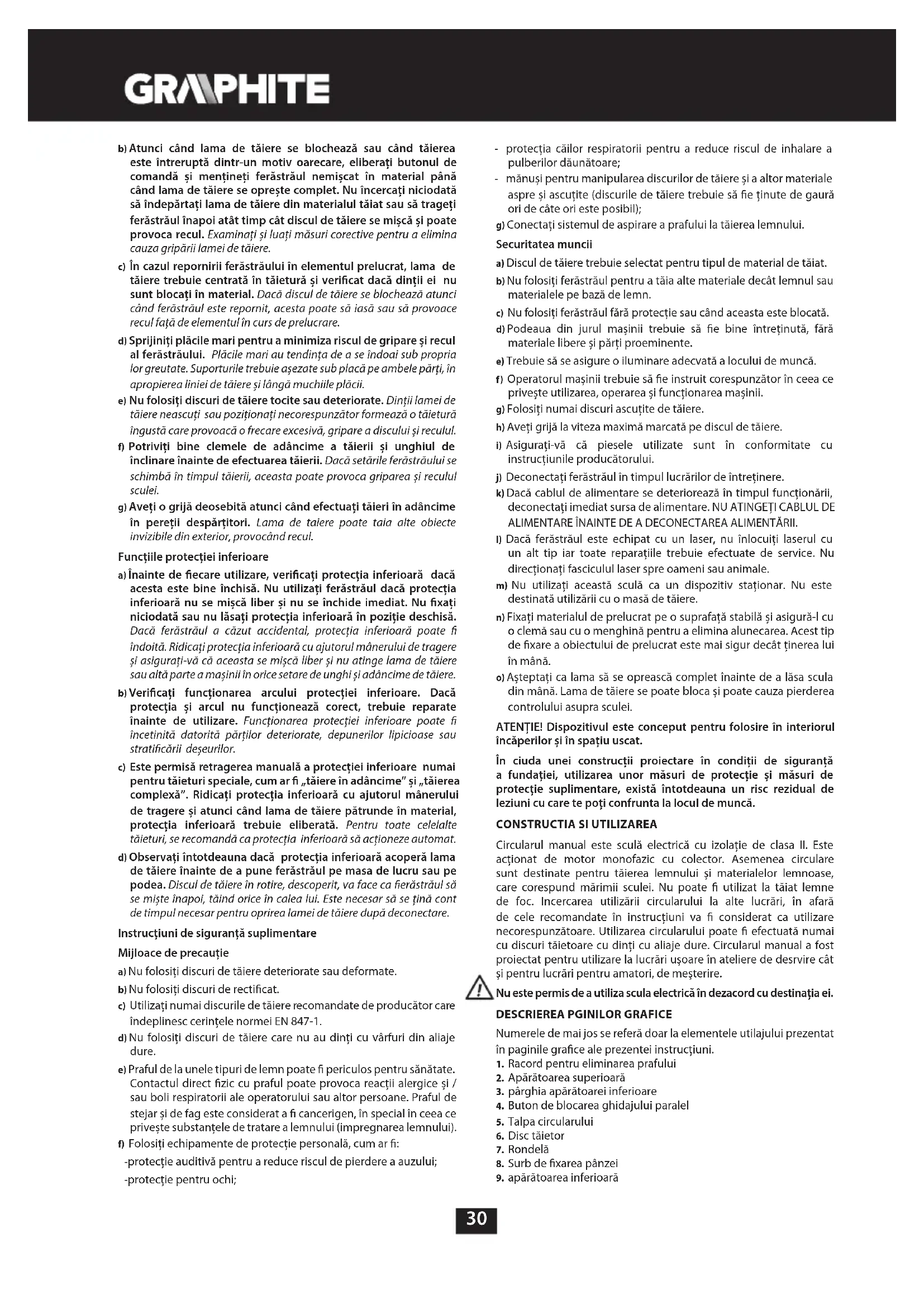 MĂSURI DETALIATE PRIVIND SIGURANȚA UTILIZĂRII FERĂSTRAIELOR CIRCULARE LA TĂIEREA FĂRĂ PANĂ DE DESPICAT Procedura de tăiere a) PERICOL: Țineți mâinile departe de zona de tăiere și de discul de tăiere. Țineți a doua mână pe mânerul auxiliar sau pe carcasa motorului. Dacă ferăstrăul este ținut cu ambele mâini, riscul de rănire din partea discului de tăiere este redus. b) Nu atingeți cu mâna fundul obiectului de prelucrat. Potecția nu vă poate proteja de discul de tăiere rotativ sub piesa de prelucrat. c) Reglați adâncimea de tăiere în funcție de grosimea obiectului de prelucrat. Se recomandă ca discul de tăiere să iasă de sub materialul de tăiat mai puțin decât înălțimea unui dinte. d) Nu țineți niciodată elementul de tăiat în mâini sau pe picior. Fixați obiectul prelucrat pe o bază solidă. Atașamentul bun al piesei este important pentru a evita pericolul contactului cu corpul, blocarea discului rotativ de tăiere sau pierderea controlului asupra tăierii. e) În timpul funcționării, când discul de tăiere rotativ poate avea contact cu cablurile sub tensiune sau cu cablu de alimentare a ferăstrăului, trebuie să țineți ferăstrăul de suprafețele izolate în acest scop. Contactul cu „rele sub tensiune” ale părților metalice ale sculei electrice poate provoca șocuri electrice operatorului. f) Utilizați întotdeauna ghidajul de tăiere atunci când tăiați în lungime sau ghidajul de margine. În acest fel se îmbunătățește precizia de tăiere și se reduce posibilitatea de blocare a discului de tăiere rotativ. g) Utilizați întotdeauna un disc de tăiere cu dimensiuni corecte a oriciilor de xare. Discurile de tăiere care nu se potrivesc la locașul de xare pot funcționa excentric, determinând pierderea controlului asupra lucrului. h) Nu folosiți niciodată șaibe sau șuruburi deteriorate sau neadecvate pentru xarea discului de tăiere. Șaibele și șuruburile de xare a discului tăietor au fost special proiectate pentru ferăstrău în scopul asigurării funcționării optime și securității în utilizare. Cauzele reculului și prevenirea reculului. - Reculul constă în ridicarea și retragerea bruscă a ferăstrăului în direcția operatorului pe linia de tăiere, cauzată de discul de tăiere gripat sau ghidat incorect. - Când discul de tăiere al ferăstrăului este agățat sau strâns în slot, el se oprește, iar reacția motorului provoacă o deplasare bruscă a ferăstrăului înapoi spre operator. - Dacă discul de tăiere este deformat sau incorect poziționat în elementul de prelucrat, dinții acestuia, după ieșirea din material, pot atinge suprafața superioară a materialului tăiat, prococând ridicarea discului și a întregului ferăstrău, precum și recul spre operator. Reculul este efectul utilizării necorespunzătoare a ferăstrăului sau a procedurilor incorecte sau a condițiilor de funcționare și poate evitat prin luarea măsurilor de precauție adecvate. a) Țineți ferm ferăstrăul cu ambele mâini, cu brațele xate pentru a rezista forței de recul. Poziția corpului trebuie să e în lateral față de ferăstrău și nu pe linia de tăiere. Reculul poate determina deplasarea bruscă a ferăstrăului spre spate, dar forța de recul se poate controla de către operator dacă se iau măsuri de precauție adecvate.30 b) Atunci când lama de tăiere se blochează sau când tăierea este întreruptă dintr-un motiv oarecare, eliberați butonul de comandă și mențineți ferăstrăul nemișcat în material până când lama de tăiere se oprește complet. Nu încercați niciodată să îndepărtați lama de tăiere din materialul tăiat sau să trageți ferăstrăul înapoi atât timp cât discul de tăiere se mișcă și poate provoca recul. Examinați și luați măsuri corective pentru a elimina cauza gripării lamei de tăiere. c) În cazul repornirii ferăstrăului în elementul prelucrat, lama de tăiere trebuie centrată în tăietură și vericat dacă dinții ei nu sunt blocați în material. Dacă discul de tăiere se blochează atunci când ferăstrăul este repornit, acesta poate să iasă sau să provoace recul față de elementul în curs de prelucrare. d) Sprijiniți plăcile mari pentru a minimiza riscul de gripare și recul al ferăstrăului. Plăcile mari au tendința de a se îndoai sub propria lor greutate. Suporturile trebuie așezate sub placă pe ambele părți, în apropierea liniei de tăiere și lângă muchiile plăcii. e) Nu folosiți discuri de tăiere tocite sau deteriorate. Dinții lamei de tăiere neascuți sau poziționați necorespunzător formează o tăietură îngustă care provoacă o frecare excesivă, gripare a discului și reculul. f) Potriviți bine clemele de adâncime a tăierii și unghiul de înclinare înainte de efectuarea tăierii. Dacă setările ferăstrăului se schimbă în timpul tăierii, aceasta poate provoca griparea și reculul sculei. g) Aveți o grijă deosebită atunci când efectuați tăieri în adâncime în pereții despărțitori. Lama de taiere poate taia alte obiecte invizibile din exterior, provocând recul. Funcțiile protecției inferioare a) Înainte de ecare utilizare, vericați protecția inferioară dacă acesta este bine închisă. Nu utilizați ferăstrăul dacă protecția inferioară nu se mișcă liber și nu se închide imediat. Nu xați niciodată sau nu lăsați protecția inferioară în poziție deschisă. Dacă ferăstrăul a căzut accidental, protecția inferioară poate îndoită. Ridicați protecția inferioară cu ajutorul mânerului de tragere și asigurați-vă că aceasta se mișcă liber și nu atinge lama de tăiere sau altă parte a mașinii în orice setare de unghi și adâncime de tăiere. b) Vericați funcționarea arcului protecției inferioare. Dacă protecția și arcul nu funcționează corect, trebuie reparate înainte de utilizare. Funcționarea protecției inferioare p