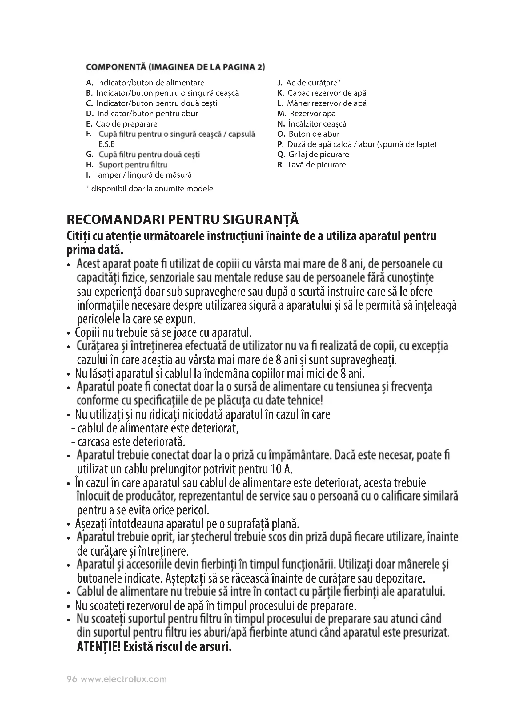 în care butoanele și z reveni la modul stand-by. Efectuați pașii 1-4 de două ori înainte de a utiliza aparatul. Bucurați-vă de noul dumneavoastră produs Electrolux!100 www.electrolux.com DEPANARE SOLUȚIE Se scurge apă din partea de jos a aparatului de cafea. Este prea multă apă în tava de picurare. Vă rugăm să curățați tava de picurare. Aparatul de cafea este defect. Vă rugăm să contactați unitatea de service autorizată pentru reparații. pe capul de preparare. Curățați cafeaua măcinată de Gust acid (oțet) în cafeaua espresso. Curățați aparatul în conformitate cu pașii 1-4 pentru „pornirea aparatului pentru prima dată” Cafeaua măcinată este depozitată într- un loc cald și umed pentru o perioadă lungă de timp. Cafeaua măcinată se strică. Vă rugăm să folosiți cafea măcinată proaspătă sau să păstrați cafeaua măcinată nefolosită într-un loc răcoros și uscat. După ce deschideți un pachet de cafea măcinată, resigilați-l bine și păstrați-l în frigider pentru a-i menține prospețimea. Aparatul de cafea nu mai poate funcționa sau nu reacționează deloc. Priza de curent nu este bine conectată. Conectați corect cablul de alimentare la o priză cu împământare. Dacă aparatul continuă să nu funcționeze, vă rugăm să contactați un service autorizat pentru reparații. Aburul / spumarea laptelui nu funcționează corect. Indicatorul alb nu este aprins. Numai după ce se aprinde indicatorul alb, stația de abur efectua spumarea laptelui. Recipientul este prea mare sau forma nu este potrivită. Folosiți o cană înaltă și îngustă sau o carafă profesională pentru spumarea laptelui. Ați folosit lapte degresat Folosiți lapte integral sau lapte semidegresat. Indicatorul de abur clipește rapid Abur continuu timp de 3 minute dar butonul de abur nu se resetează. Resetați butonul de abur în poziția „OPRIT”. Indicatorul pentru o ceașcă și indicatorul pentru două cești clipesc rapid Distribuiți 40 ml de apă caldă dar apoi butonul de abur nu se resetează. Resetați butonul de abur în poziția „OPRIT”. Butonul de abur nu se resetează după răcire. mare. Răciți-l prin efectuarea PASULUI