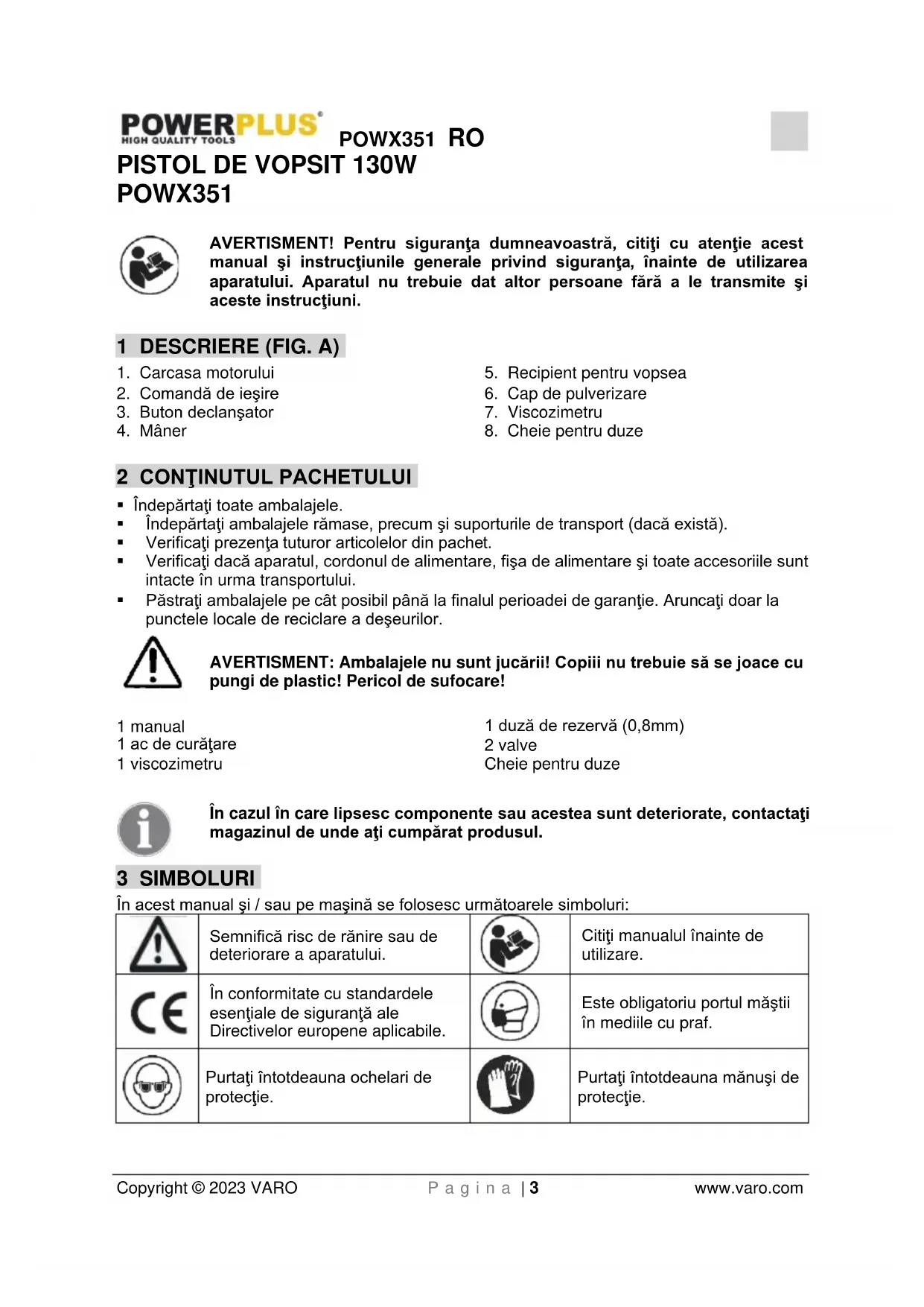 - VENTILAŢIE - La pulverizare, asiguraţi întotdeauna o ventilaţie corespunzătoare zonei de lucru.POWX351 RO Copyright © 2023 VARO P a g i n a | 6 www.varo.com