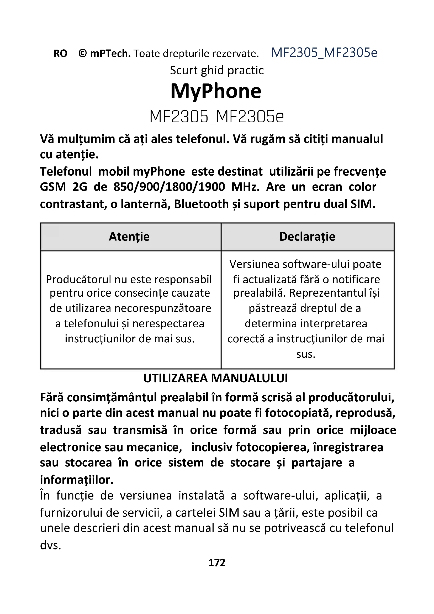UTILIZAREA MANUALULUI Fără consimțământul prealabil în formă scrisă al producătorului, nici o parte din acest manual nu poate fi fotocopiată, reprodusă, tradusă sau transmisă în orice formă sau prin orice mijloace electronice sau mecanice, inclusiv fotocopierea, înregistrarea sau stocarea în orice sistem de stocare și partajare a informațiilor. În funcție de versiunea instalată a software-ului, aplicații, a furnizorului de servicii, a cartelei SIM sau a țării, este posibil ca unele descrieri din acest manual să nu se potrivească cu telefonul dvs.RO © mPTech. Toate drepturile rezervate. MF2305_MF2305e