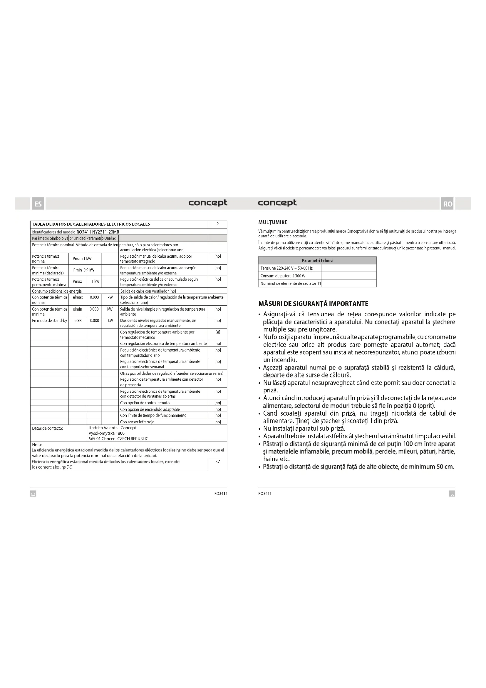 RO3411 MULȚUMIRE Vă mulțumim pentru achiziționarea produsului marca Concept și vă dorim să fiți mulțumiți de produsul nostru pe întreaga durată de utilizare a acestuia. Înainte de prima utilizare citiți cu atenție și în întregime manualul de utilizare și păstrați-l pentru o consultare ulterioară. Asigurați-vă că și celelalte persoane care vor folosi produsul sunt familiarizate cu instrucțiunile prezentate în prezentul manual. Parametri tehnici Tensiune 220-240 V ~ 50/60 Hz Consum de putere 2 300 W Numărul de elemente de radiator 11 TABLA DE DATOS DE CALENTADORES ELÉCTRICOS LOCALES