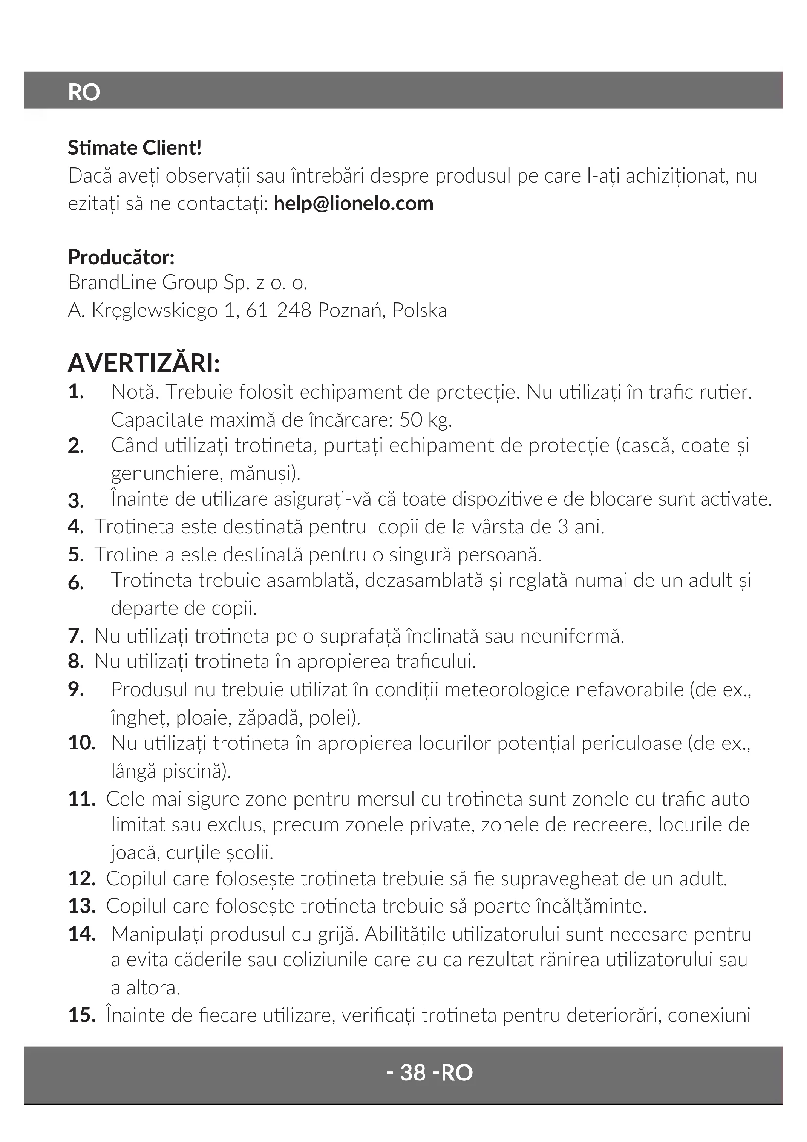 Smate Client! Dacă aveți observații sau întrebări despre produsul pe care l-ați achiziționat, nu ezitați să ne contactați: help@lionelo.com Producător: BrandLine Group Sp. z o. o. A. Kręglewskiego 1, 61-248 Poznań, Polska AVERTIZĂRI:
