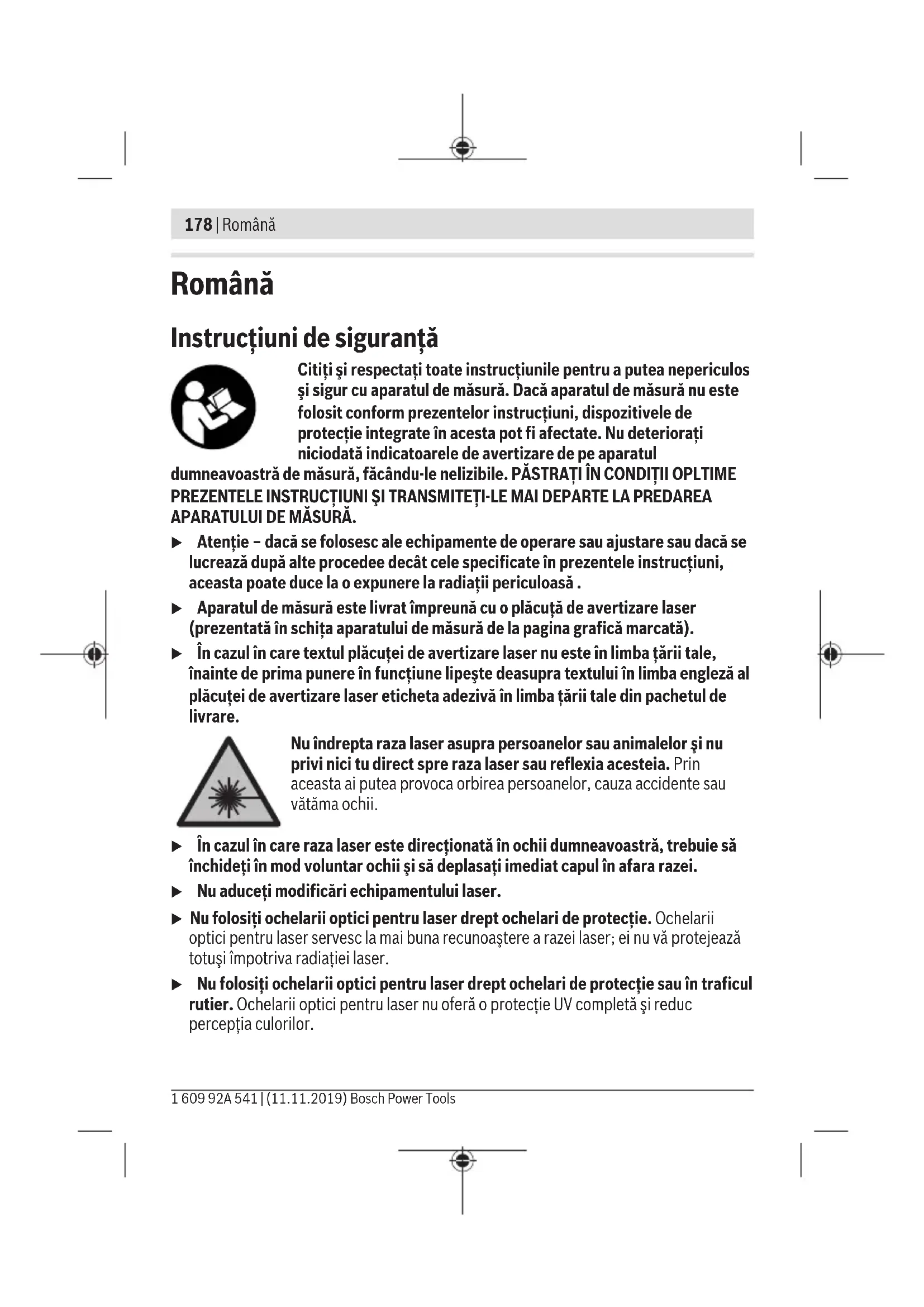 Кәдеге жарату Өлшеу құралын, оның жабдықтары мен қаптамасын қоршаған ортаны қорғайтын кәдеге жарату орнына тапсыру қажет. Қлшеу құралдарын не батареяларды үй қоқысына тастамаңыз! Тек қана ЕО елдері үшін: Еуропа 2012/19/EU ережесі бойынша жарамсыз өлшеу құралдары және Еуропа 2006/66/EC ережесі бойынша зақымдалған немесе ескі аккумулятор/батареялар бөлек жиналып кәдеге жаратылуы қажет. Bosch Power Tools 1 609 92A 541 | (11.11.2019)178 | Română Română Instrucţiuni de siguranţă Citiţi şi respectaţi toate instrucţiunile pentru a putea nepericulos şi sigur cu aparatul de măsură. Dacă aparatul de măsură nu este folosit conform prezentelor instrucţiuni, dispozitivele de protecţie integrate în acesta pot fi afectate. Nu deterioraţi niciodată indicatoarele de avertizare de pe aparatul dumneavoastră de măsură, făcându-le nelizibile. PĂSTRAŢI ÎN CONDIŢII OPLTIME PREZENTELE INSTRUCŢIUNI ŞI TRANSMITEŢI-LE MAI DEPARTE LA PREDAREA APARATULUI DE MĂSURĂ. u Atenţie – dacă se folosesc ale echipamente de operare sau ajustare sau dacă se lucrează după alte procedee decât cele specificate în prezentele instrucţiuni, aceasta poate duce la o expunere la radiaţii periculoasă . u Aparatul de măsură este livrat împreună cu o plăcuţă de avertizare laser (prezentată în schiţa aparatului de măsură de la pagina grafică marcată). u În cazul în care textul plăcuţei de avertizare laser nu este în limba ţării tale, înainte de prima punere în funcţiune lipeşte deasupra textului în limba engleză al plăcuţei de avertizare laser eticheta adezivă în limba ţării tale din pachetul de livrare. Nu îndrepta raza laser asupra persoanelor sau animalelor şi nu privi nici tu direct spre raza laser sau reflexia acesteia. Prin aceasta ai putea provoca orbirea persoanelor, cauza accidente sau vătăma ochii. u În cazul în care raza laser este direcţionată în ochii dumneavoastră, trebuie să închideţi în mod voluntar ochii şi să deplasaţi imediat capul în afara razei. u Nu aduceţi modificări echipamentului laser. u Nu folosiţi ochelarii optici pentru laser drept ochelari de protecţie. Ochelarii optici pentru laser servesc la mai buna recunoaştere a razei laser; ei nu vă protejează totuşi împotriva radiaţiei laser. u Nu folosiţi ochelarii optici pentru laser drept ochelari de protecţie sau în traficul rutier. Ochelarii optici pentru laser nu oferă o protecţie UV completă şi reduc percepţia culorilor. 1 609 92A 541 | (11.11.2019) Bosch Power ToolsRomână | 179 u Nu permiteţi repararea aparatului de măsură decât de către personal de specialitate corespunzător calificat şi numai cu piese de schimb originale. Numai în acest mod poate fi garantată siguranţa de exploatare a aparatului de măsură. u Nu lăsaţi copiii să folosească nesupravegheaţi aparatul de măsură cu laser. Ei ar putea provoca involuntar orbirea unor persoane. u Nu lucraţi cu aparatul de măsură în mediu cu pericol de explozie în care se află lichide, gaze sau pulberi inflamabile. În aparatul de măsură se pot produce scântei care să aprindă praful sau vaporii. Nu aduce magnetul în apropierea implanturilor şi altor aparate medicale cum ar fi, de exemplu, stimulatoarele cardiace sau pompele de insulină. Câmpul generat de magnetpoate perturba funcţionarea implanturilor sau aparatelor medicale. u Ţineţi aparatul de măsură la distanţă faţă de suporturile magnetice de date şi de dispozitivele sensibile la câmpurile magnetice. Prin acţiunea magneţilor se poate ajunge la pierderi ireversibile de date. Descrierea produsului şi a performanțelor sale Ţineţi cont de ilustraţiile din secţiunea anterioară a instrucţiunilor de utilizare. Utilizarea conform destinaţiei Aparatul de măsură este destinat proiectării şi verificării de linii orizontale şi verticale, precum şi de puncte pe direcţia normalei. Aparatul de măsură este destinat utilizării în mediul interior. Componentele ilustrate Numerotarea componentelor ilustrate se referă la schiţa aparatului de măsură de la pagina grafică. (1) Tastă pentru modul de funcţionare LaserMode (2) Tastă pentru funcţionarea în poziţie înclinată (3) Indicator de stare (4) Comutator de pornire/oprire (5) Magnet (în interior) (6) Orificiu de ieşire a liniei laser (7) Stativ