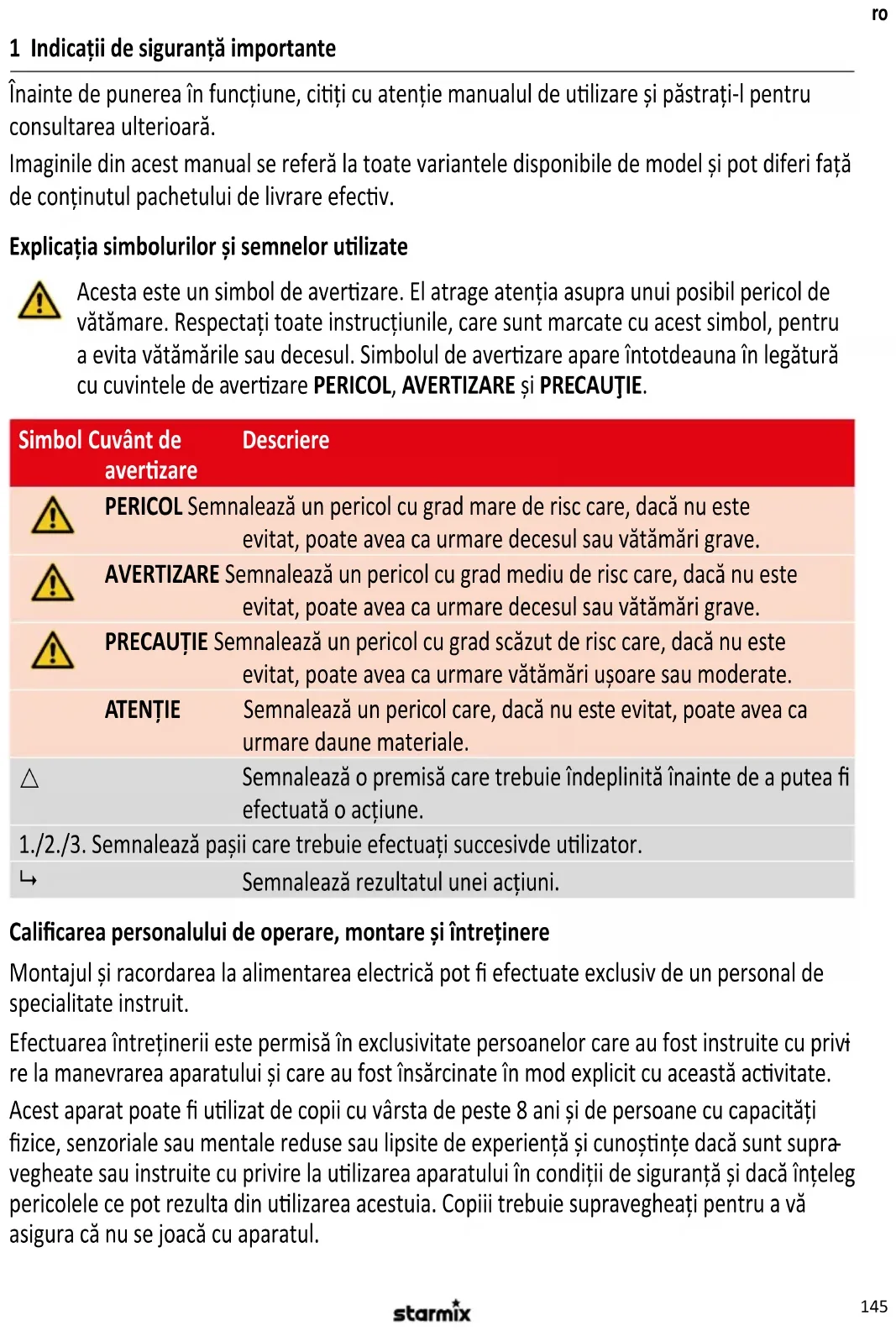re la manevrarea aparatului și care au fost însărcinate în mod explicit cu această acvitate. Acest aparat poate ulizat de copii cu vârsta de peste 8 ani și de persoane cu capacități zice, senzoriale sau mentale reduse sau lipsite de experiență și cunoșnțe dacă sunt supra