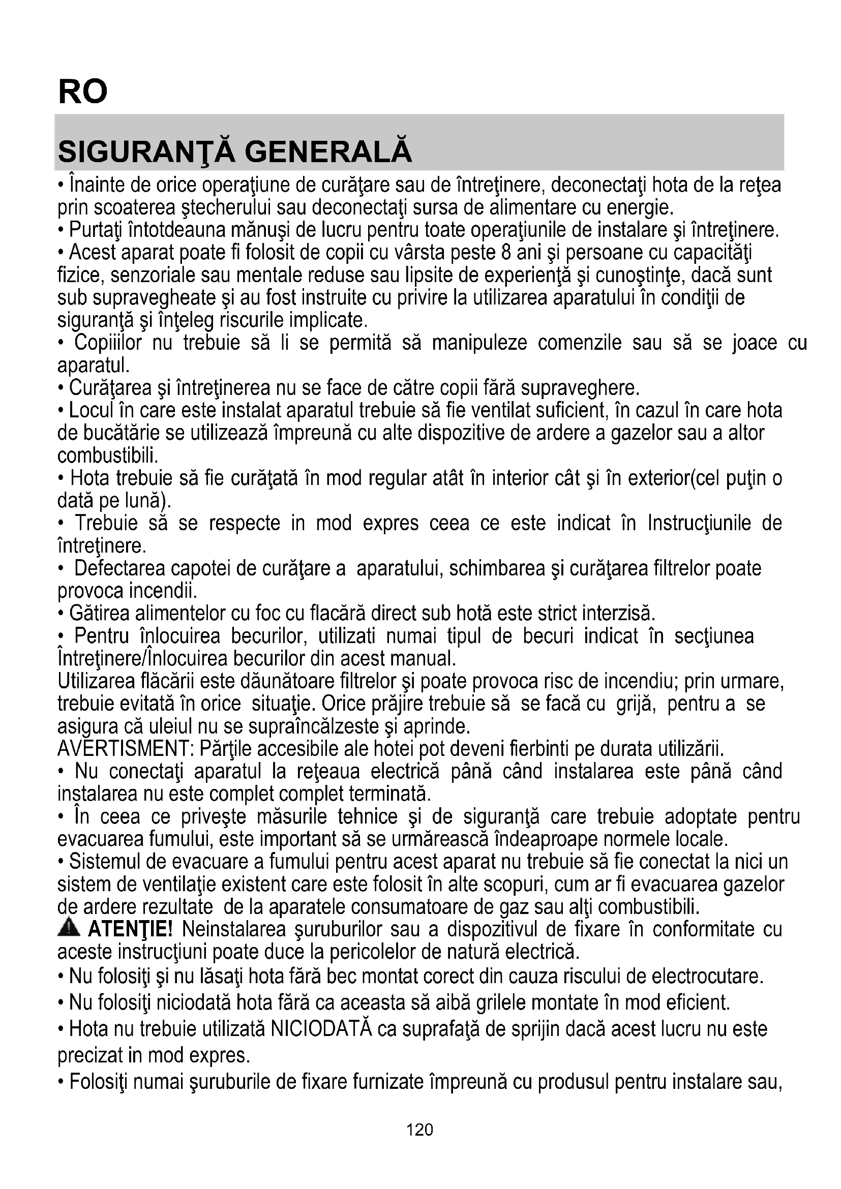- Locul în care este instalat aparatul trebuie să fie ventilat suficient, în cazul în care hota de bucătărie se utilizează împreună cu alte dispozitive de ardere a gazelor sau a altor combustibili.