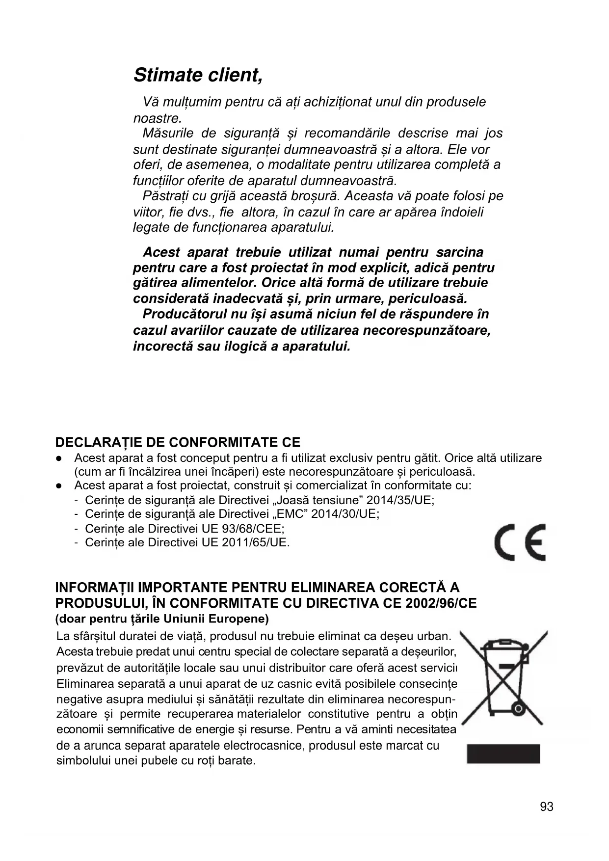 Stimate client, Vă mulțumim pentru că ați achiziționat unul din produsele noastre. Măsurile de siguranță și recomandările descrise mai jos sunt destinate siguranței dumneavoastră și a altora. Ele vor oferi, de asemenea, o modalitate pentru utilizarea completă a funcțiilor oferite de aparatul dumneavoastră. Păstrați cu grijă această broșură. Aceasta vă poate folosi pe viitor, fie dvs., fie altora, în cazul în care ar apărea îndoieli legate de funcționarea aparatului. Acest aparat trebuie utilizat numai pentru sarcina pentru care a fost proiectat în mod explicit, adică pentru gătirea alimentelor. Orice altă formă de utilizare trebuie considerată inadecvată și, prin urmare, periculoasă. Producătorul nu își asumă niciun fel de răspundere în cazul avariilor cauzate de utilizarea necorespunzătoare, incorectă sau ilogică a aparatului.