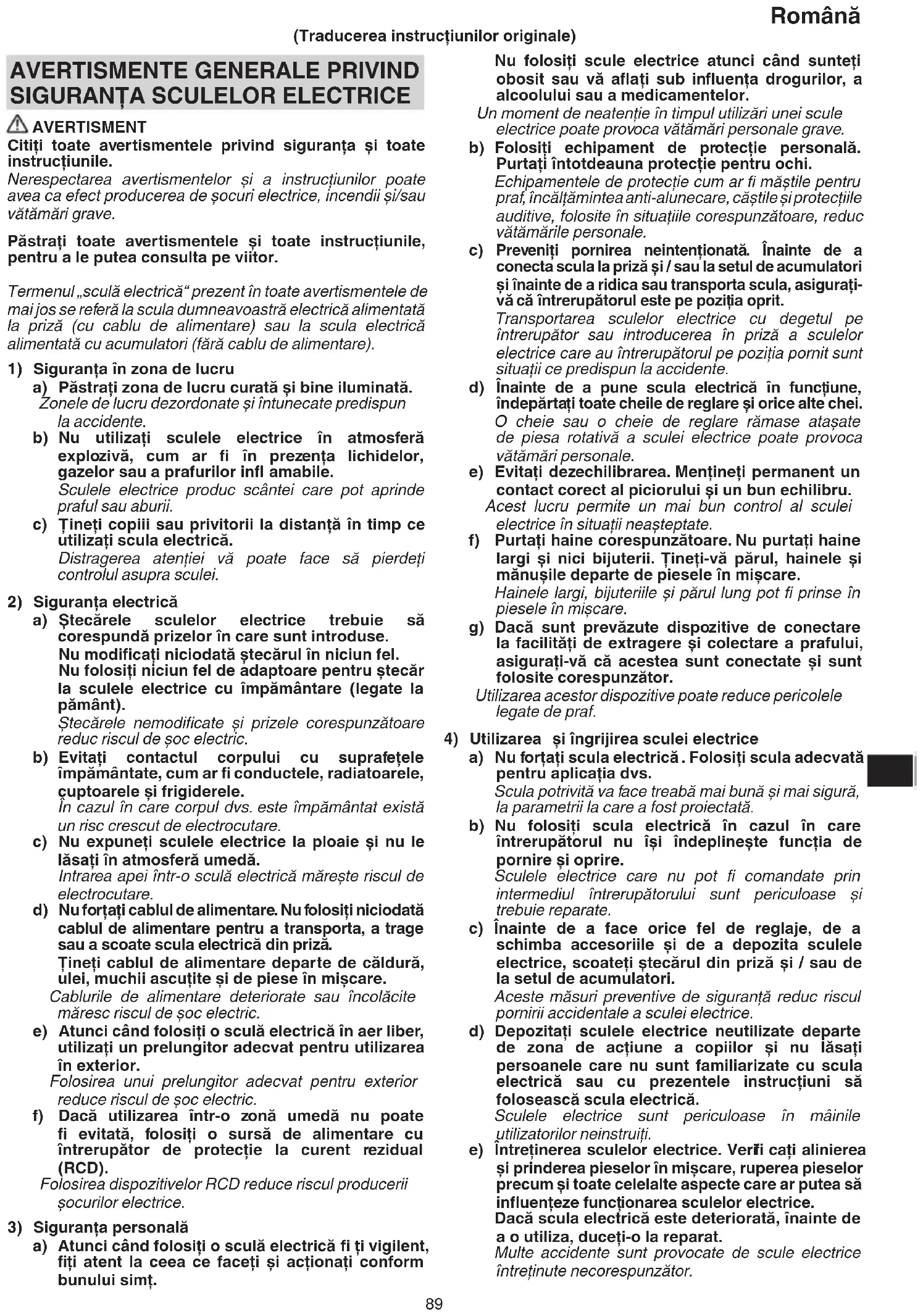 a) Atunci când folosiţi o sculă electrică fi ţi vigilent, fi ţi atent la ceea ce faceţi și acţionaţi conform bunului simţ. (Traducerea instrucţiunilor originale) 0000BookG10SR4.indb890000BookG10SR4.indb89 2017/12/1917:26:162017/12/1917:26:1690 Română f) Păstraţi elementele de tăiere curate și ascuţite. Elementele de tăiere bine întreţinute și cu muchiile de tăiere bine ascuţite sunt mai ușor de controlat și este mai puţin probabil să se agaţe. g) Folosiţi scula electrică, accesoriile și vârfurile etc. în conformitate cu prezentele instrucţiuni, luând în considerare condiţiile de lucru și operaţiunile ce urmează a fi efectuate. Folosirea sculei electrice pentru alte operaţiuni decât cele prevăzute poate avea ca efect apariţia unor situaţii periculoase.