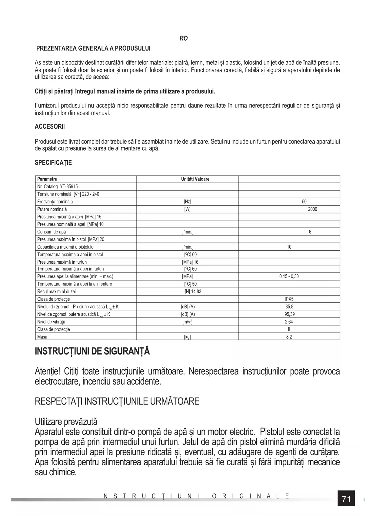 As este un dispozitiv destinat curățării diferitelor materiale: piatră, lemn, metal și plastic, folosind un jet de apă de înaltă presiune. As poate fi folosit doar la exterior și nu poate fi folosit în interior. Funcționarea corectă, fi abilă și sigură a aparatului depinde de utilizarea sa corectă, de aceea: Citiți și păstrați întregul manual înainte de prima utilizare a produsului. Furnizorul produsului nu acceptă nicio responsabilitate pentru daune rezultate în urma nerespectării regulilor de siguranță și instrucțiunilor din acest manual. ACCESORII Produsul este livrat complet dar trebuie să fi e asamblat înainte de utilizare. Setul nu include un furtun pentru conectarea aparatului de spălat cu presiune la sursa de alimentare cu apă. SPECIFICAȚIE Parametru Unități Valoare Nr. Catalog YT-85915 Tensiune nominală [V~] 220 - 240 Frecvență nominală [Hz] 50 Putere nominală [W] 2000 Presiunea maximă a apei [MPa] 15 Presiunea nominală a apei [MPa] 10 Consum de apă [l/min.] 6 Presiunea maximă în pistol [MPa] 20 Capacitatea maximă a pistolului [l/min.] 10 Temperatura maximă a apei în pistol [
