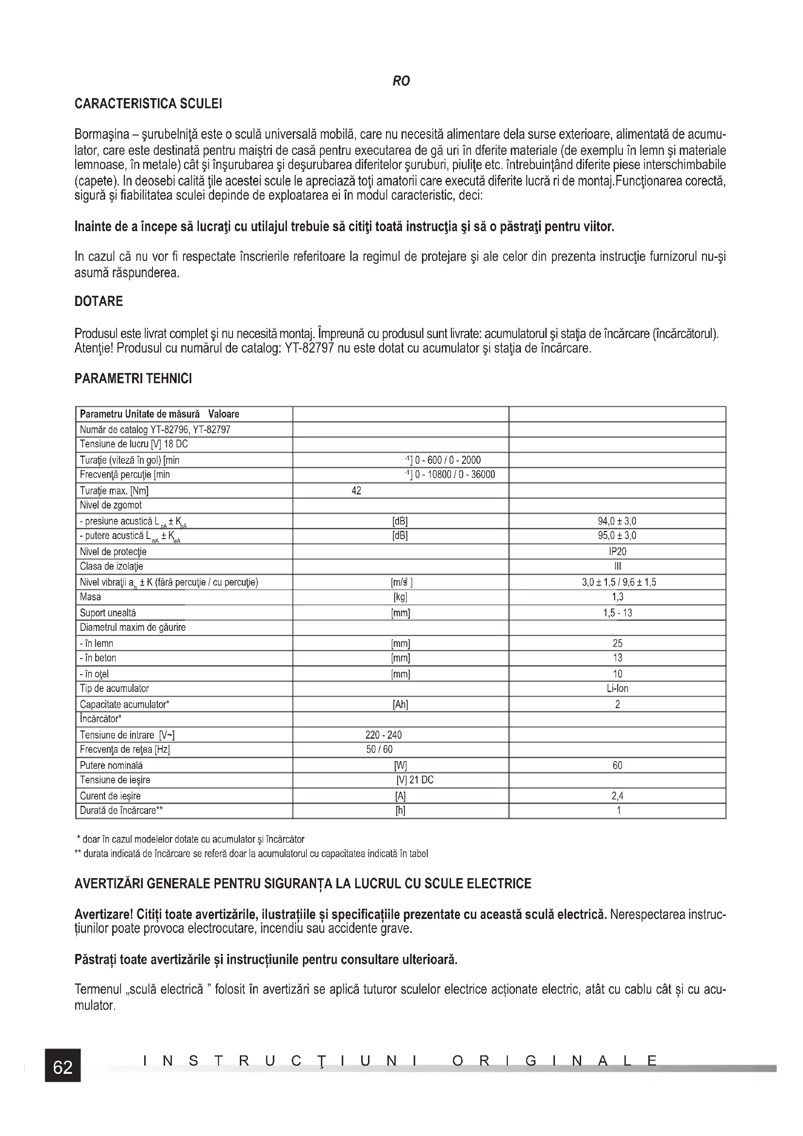 CARACTERISTICA SCULEI Bormaşina – şurubelniţă este o sculă universală mobilă, care nu necesită alimentare dela surse exterioare, alimentată de acumu- lator, care este destinată pentru maiştri de casă pentru executarea de gă uri în dferite materiale (de exemplu în lemn şi materiale lemnoase, în metale) cât şi înşurubarea şi deşurubarea diferitelor şuruburi, piuliţe etc. întrebuinţând diferite piese interschimbabile (capete). In deosebi calită ţile acestei scule le apreciază toţi amatorii care execută diferite lucră ri de montaj.Funcţionarea corectă, sigură şi fi abilitatea sculei depinde de exploatarea ei în modul caracteristic, deci: Inainte de a începe să lucraţi cu utilajul trebuie să citiţi toată instrucţia şi să o păstraţi pentru viitor. In cazul că nu vor fi respectate înscrierile referitoare la regimul de protejare şi ale celor din prezenta instrucţie furnizorul nu-şi asumă răspunderea. DOTARE Produsul este livrat complet şi nu necesită montaj. Împreună cu produsul sunt livrate: acumulatorul şi staţia de încărcare (încărcătorul). Atenţie! Produsul cu numărul de catalog: YT-82797 nu este dotat cu acumulator şi staţia de încărcare. PARAMETRI TEHNICI Parametru Unitate de măsură Valoare Număr de catalog YT-82796, YT-82797 Tensiune de lucru [V] 18 DC Turaţie (viteză în gol) [min