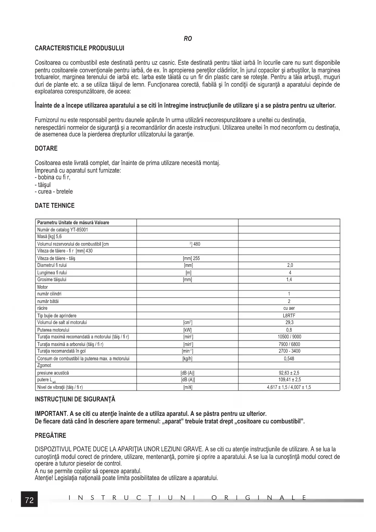 CARACTERISTICILE PRODUSULUI Cositoarea cu combustibil este destinată pentru uz casnic. Este destinată pentru tăiat iarbă în locurile care nu sunt disponibile pentru cositoarele convenţionale pentru iarbă, de ex. în apropierea pereţilor clădirilor, în jurul copacilor şi arbuştilor, la marginea trotuarelor, marginea terenului de iarbă etc. Iarba este tăiată cu un fi r din plastic care se roteşte. Pentru a tăia arbuşti, muguri duri de plante etc. a se utiliza tăişul de lemn. Funcţionarea corectă, fi abilă şi în condiţii de siguranţă a aparatului depinde de exploatarea corespunzătoare, de aceea: Înainte de a începe utilizarea aparatului a se citi în întregime instrucţiunile de utilizare şi a se păstra pentru uz ulterior. Furnizorul nu este responsabil pentru daunele apărute în urma utilizării necorespunzătoare a uneltei cu destinaţia, nerespectării normelor de siguranţă şi a recomandărilor din aceste instrucţiuni. Utilizarea uneltei în mod neconform cu destinaţia, de asemenea duce la pierderea drepturilor utilizatorului la garanţie. DOTARE Cositoarea este livrată complet, dar înainte de prima utilizare necesită montaj. Împreună cu aparatul sunt furnizate: - bobina cu fi r, - tăişul - curea - bretele DATE TEHNICE Parametru Unitate de măsură Valoare Număr de catalog YT-85001 Masă [kg] 5,6 Volumul rezervorului de combustibil [cm