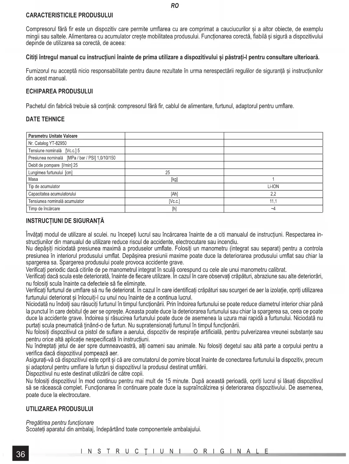 CARACTERISTICILE PRODUSULUI Compresorul fără fi r este un dispozitiv care permite umfl area cu are comprimat a cauciucurilor și a altor obiecte, de exemplu mingii sau saltele. Alimentarea cu acumulator crește mobilitatea produsului. Funcționarea corectă, fi abilă și sigură a dispozitivului depinde de utilizarea sa corectă, de aceea: Citiți întregul manual cu instrucțiuni înainte de prima utilizare a dispozitivului și păstrați-l pentru consultare ulterioară. Furnizorul nu acceptă nicio responsabilitate pentru daune rezultate în urma nerespectării regulilor de siguranță și instrucțiunilor din acest manual. ECHIPAREA PRODUSULUI Pachetul din fabrică trebuie să conțină: compresorul fără fi r, cablul de alimentare, furtunul, adaptorul pentru umfl are. DATE TEHNICE Parametru Unitate Valoare Nr. Catalog YT-82950 Tensiune nominală [Vc.c.] 5 Presiunea nominală [MPa / bar / PSI] 1,0/10/150 Debit de pompare [l/min] 25 Lungimea furtunului [cm] 25 Masa [kg] 1 Tip de acumulator Li-ION Capacitatea acumulatorului [Ah] 2,2 Tensiunea nominală acumulator [Vc.c.] 11,1 Timp de încărcare [h] ~4