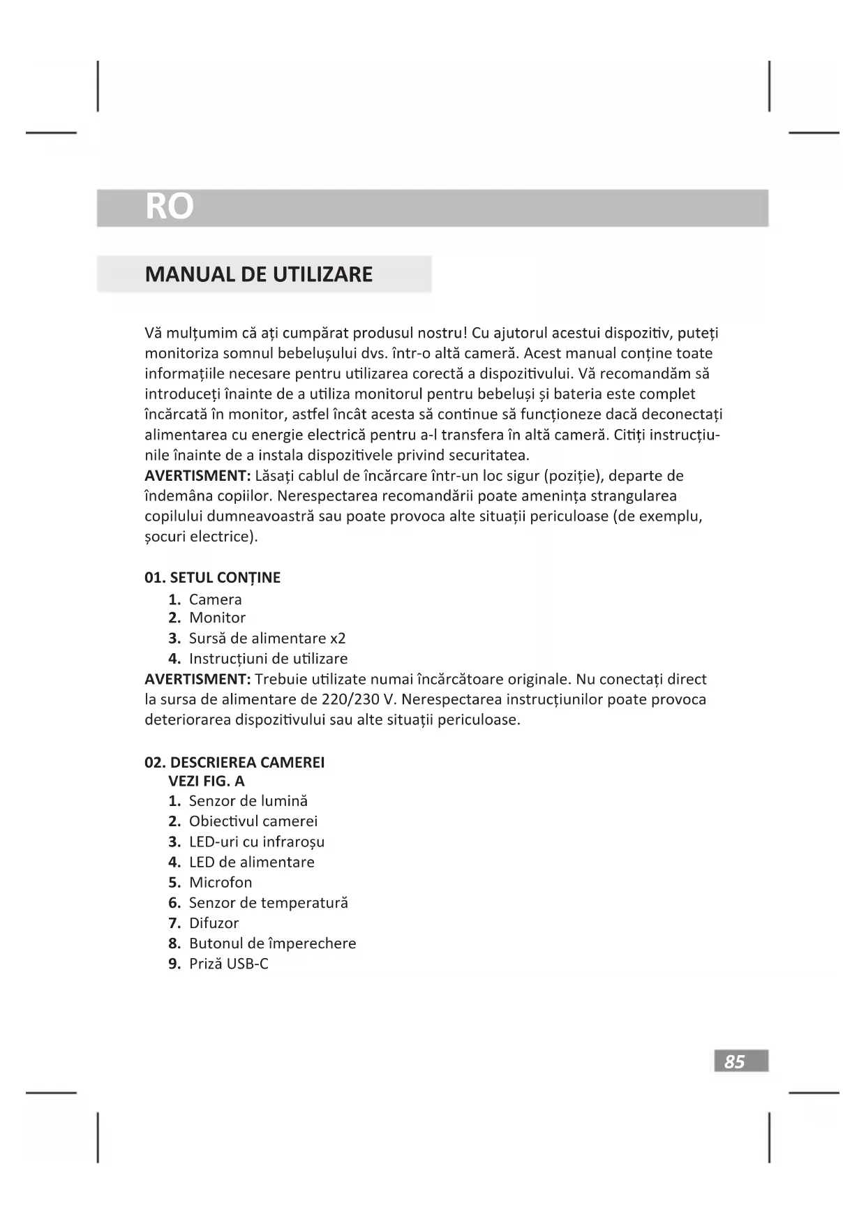 Vă mulțumim că ați cumpărat produsul nostru! Cu ajutorul acestui dispoziv, puteți monitoriza somnul bebelușului dvs. într-o altă cameră. Acest manual conține toate informațiile necesare pentru ulizarea corectă a dispozivului. Vă recomandăm să introduceți înainte de a uliza monitorul pentru bebeluși și bateria este complet încărcată în monitor, asel încât acesta să connue să funcționeze dacă deconectați alimentarea cu energie electrică pentru a-l transfera în altă cameră. Ciți instrucțiu- nile înainte de a instala dispozivele privind securitatea. AVERTISMENT: Lăsați cablul de încărcare într-un loc sigur (poziție), departe de îndemâna copiilor. Nerespectarea recomandării poate amenința strangularea copilului dumneavoastră sau poate provoca alte situații periculoase (de exemplu, șocuri electrice).