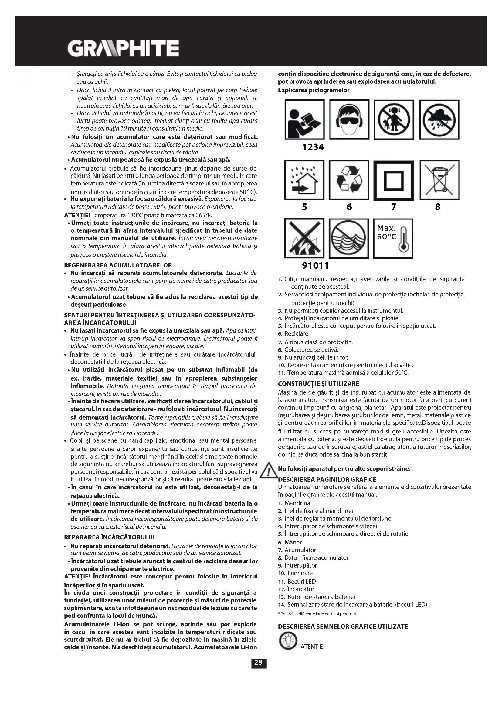 protecţie pentru urechi). 3. Nu permiteţi copiilor accesul la instrumentul. 4. Protejați încărcătorul de umiditate și ploaie.5. Incărcătorul este conceput pentru folosire în spațiu uscat.6. Reciclare.7. A doua clasă de protecţie. 8. Colectarea selectivă.9. Nu aruncaţi celule în foc.10. Reprezintă o amenințare pentru mediul acvatic.11. Temperatura maximă admisă a celulelor 50°C.