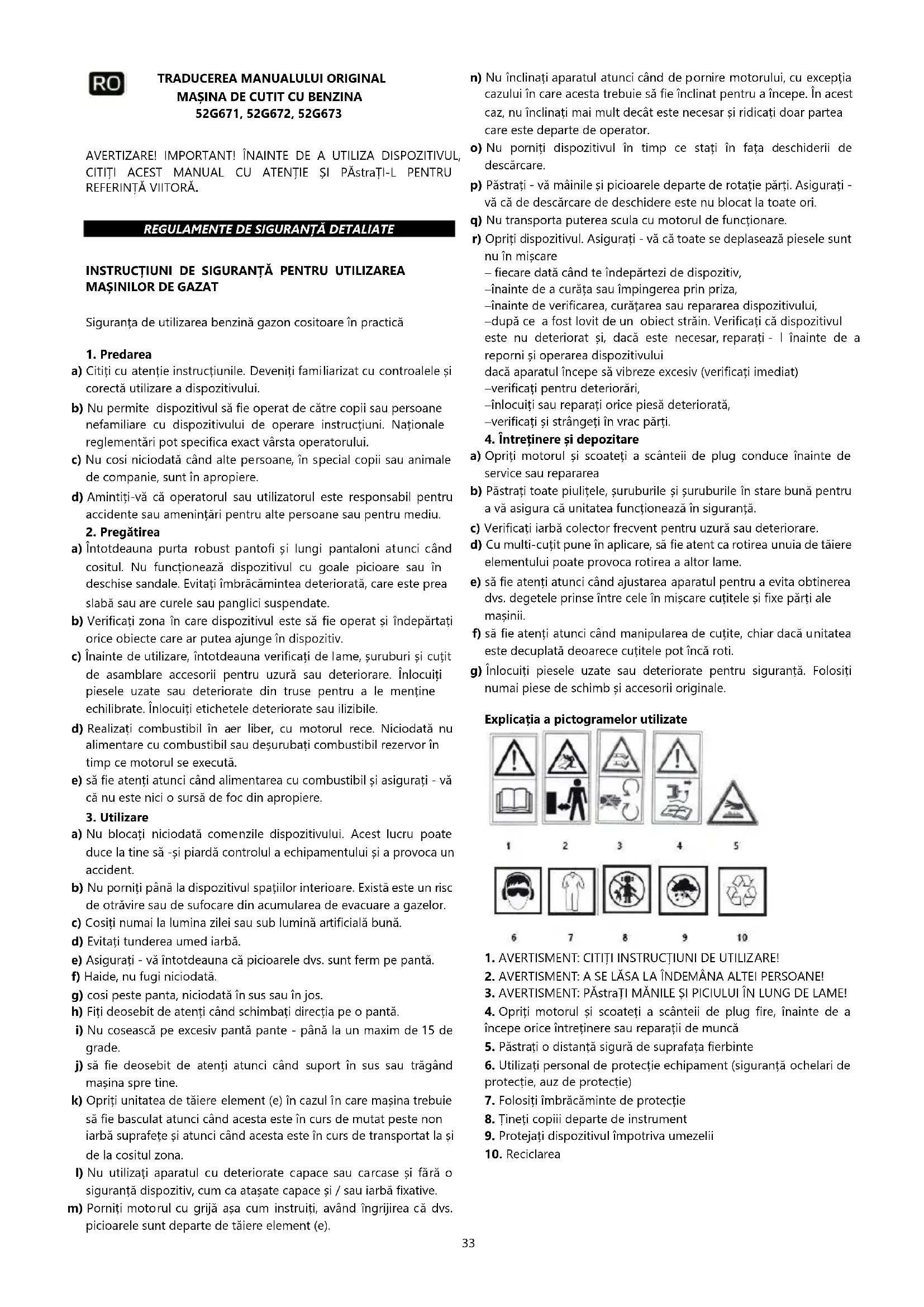a) Opriți motorul și scoateți a scânteii de plug conduce înainte de service sau repararea b) Păstrați toate piulițele, șuruburile și șuruburile în stare bună pentru a vă asigura că unitatea funcționează în siguranță. c) Verificați iarbă colector frecvent pentru uzură sau deteriorare. d) Cu multi-cuțit pune în aplicare, să fie atent ca rotirea unuia de tăiere elementului poate provoca rotirea a altor lame. e) să fie atenți atunci când ajustarea aparatul pentru a evita obtinerea dvs. degetele prinse între cele în mișcare cuțitele și fixe părți ale mașinii. f) să fie atenți atunci când manipularea de cuțite, chiar dacă unitatea este decuplată deoarece cuțitele pot încă roti. g) Înlocuiți piesele uzate sau deteriorate pentru siguranță. Folosiți numai piese de schimb și accesorii originale. Explicația a pictogramelor utilizate