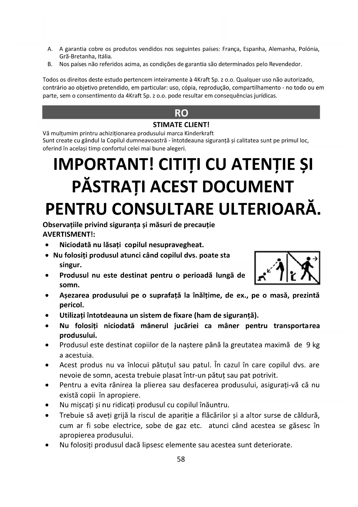 Simbolul coșului de gunoi tăiat plasat pe echipamente, baterii, ambalaje sau documentele atașate acestuia înseamnă că produsul nu trebuie aruncat cu alte deșeuri. Responsabilitatea utilizatorului este de a preda echipamentele și bateriile uzate într-un punct de colectare desemnat pentru o prelucrare corespunzătoare. Informații despre sistemul disponibil pentru colectarea deșeurilor de echipamente electrice și baterii pot fi găsite în biroul de informații al magazinului și la primăria de oraș / comună. Fiecare gospodărie este un utilizator de echipamente electrice și electronice și baterii și, astfel, un potențial producător de deșeuri periculoase pentru oameni și mediu, datorită prezenței în echipament și baterii a unor substanțe, amestecuri și componente periculoase. Pe de altă parte, echipamentul folosit este un material valoros din care putem recupera materii prime precum cupru, staniu, sticlă, fier și altele. Eliminarea corespunzătoare a echipamentelor și bateriilor uzate previne consecințele negative asupra mediului natural și sănătății umane!62 Garanții A. Garanția se aplică produselor vândute în următoarele țări: Franța, Spania, Germania, Polonia, Marea Britanie, Italia. B. În țările care nu au fost menționate mai sus, condițiile de garanție vor fi stabilite de către Vânzător. Toate drepturile asupra acestui studiu aparțin în totalitate companiei 4Kraft Sp. z o.o. Orice utilizare neautorizată contrar scopului propus, în special: utilizarea, copierea, reproducerea, distribuirea - integral sau parțial, fără acordul 4Kraft Sp. z o.o. poate duce la consecințe legale. УВАЖАЕМЫЙ КЛИЕНТ! Благодарим Вас за покупку продукта Kinderkraft. Мы создаем с учетом вашего ребенка - мы всегда заботимся о безопасности и качестве, тем самым обеспечивая комфорт наилучшего выбора. ВАЖНО! ПРОЧТИТЕ ВНИМАТЕЛЬНО И СОХРАНИТЕ НА