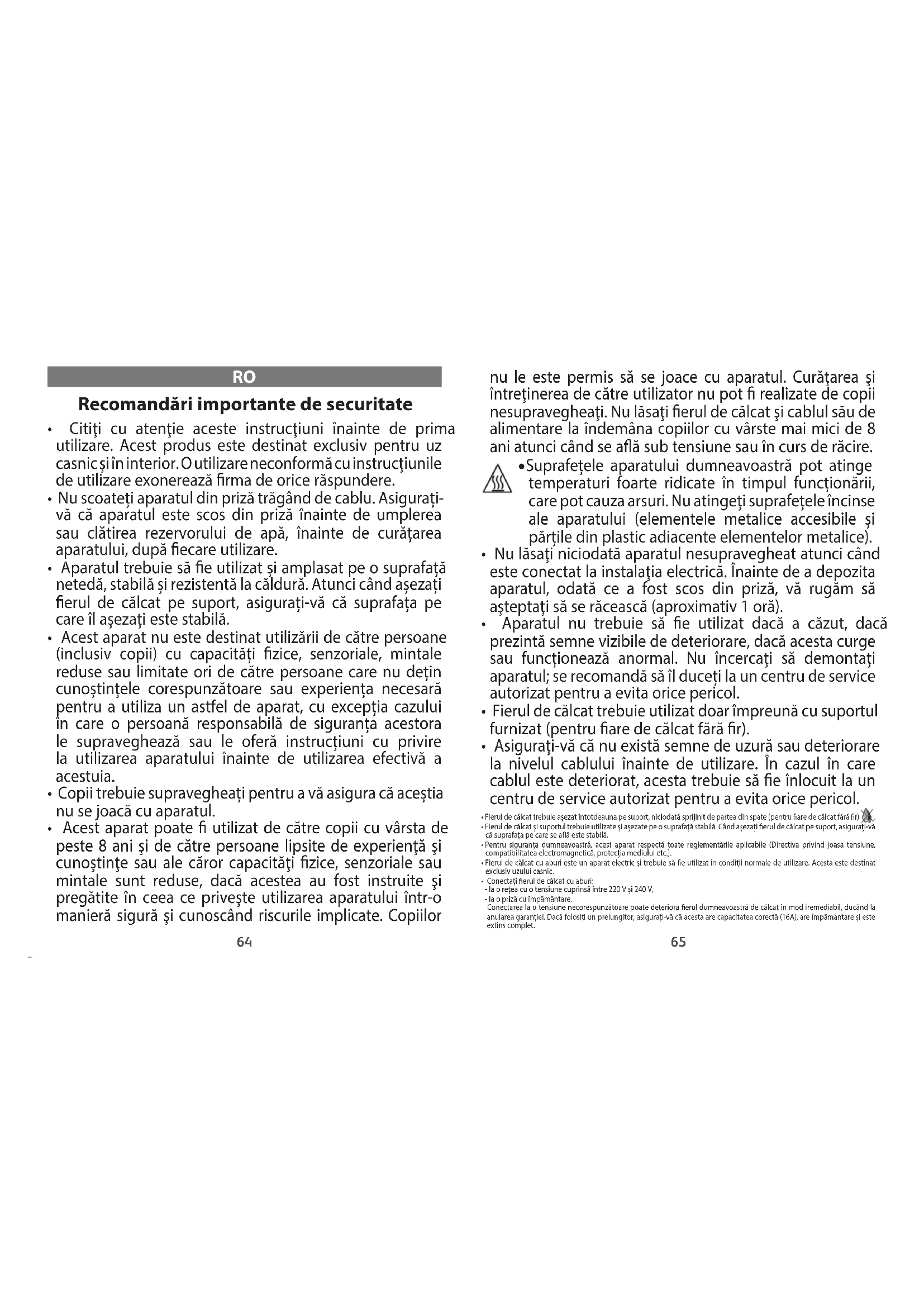 nu le este permis să se joace cu aparatul. Curăţarea şi întreţinerea de către utilizator nu pot realizate de copii nesupravegheaţi. Nu lăsaţi erul de călcat şi cablul său de alimentare la îndemâna copiilor cu vârste mai mici de 8 ani atunci când se aă sub tensiune sau în curs de răcire.