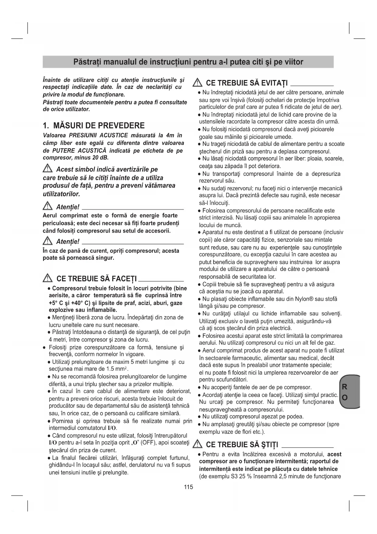Valoarea PRESIUNII ACUSTICE măsurată la 4m în câmp liber este egală cu diferenta dintre valoarea de PUTERE ACUSTICĂ indicată pe eticheta de pe compresor, minus 20 dB. Acest simbol indică avertizările pe care trebuie să le citiţi înainte de a utiliza produsul de faţă, pentru a preveni vătămarea utilizatorilor. Atenţie! Aerul comprimat este o formă de energie foarte periculoasă; este deci necesar să ţi foarte prudenţi când folosiţi compresorul sau setul de accesorii. Atenţie! În caz de pană de curent, opriţi compresorul; acesta poate să pornească singur.