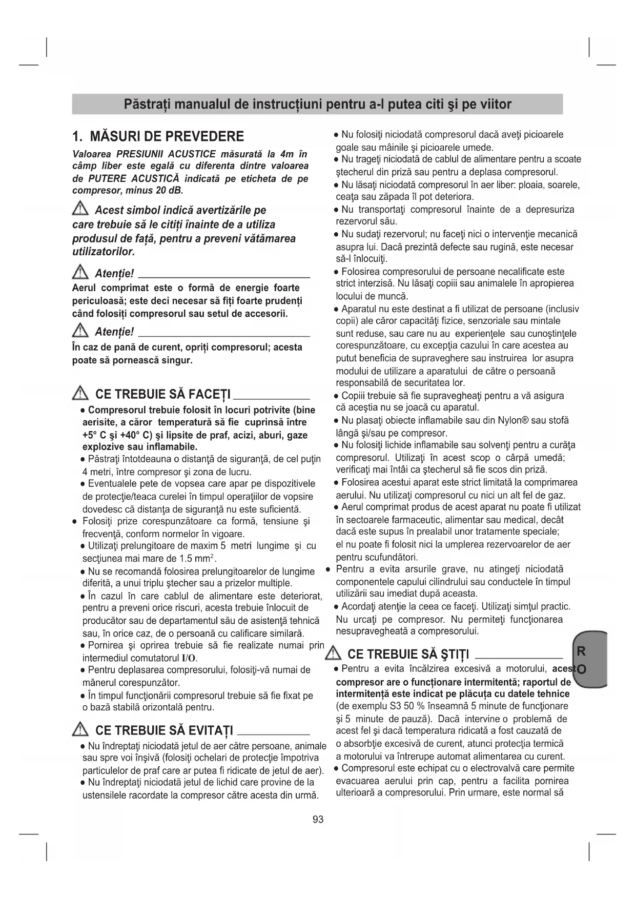 Valoarea PRESIUNII ACUSTICE măsurată la 4m în câmp liber este egală cu diferenta dintre valoarea de PUTERE ACUSTICĂ indicată pe eticheta de pe compresor, minus 20 dB. Acest simbol indică avertizările pe care trebuie să le citiţi înainte de a utiliza produsul de faţă, pentru a preveni vătămarea utilizatorilor. Atenţie! Aerul comprimat este o formă de energie foarte periculoasă; este deci necesar să ţi foarte prudenţi când folosiţi compresorul sau setul de accesorii. Atenţie! În caz de pană de curent, opriţi compresorul; acesta poate să pornească singur.