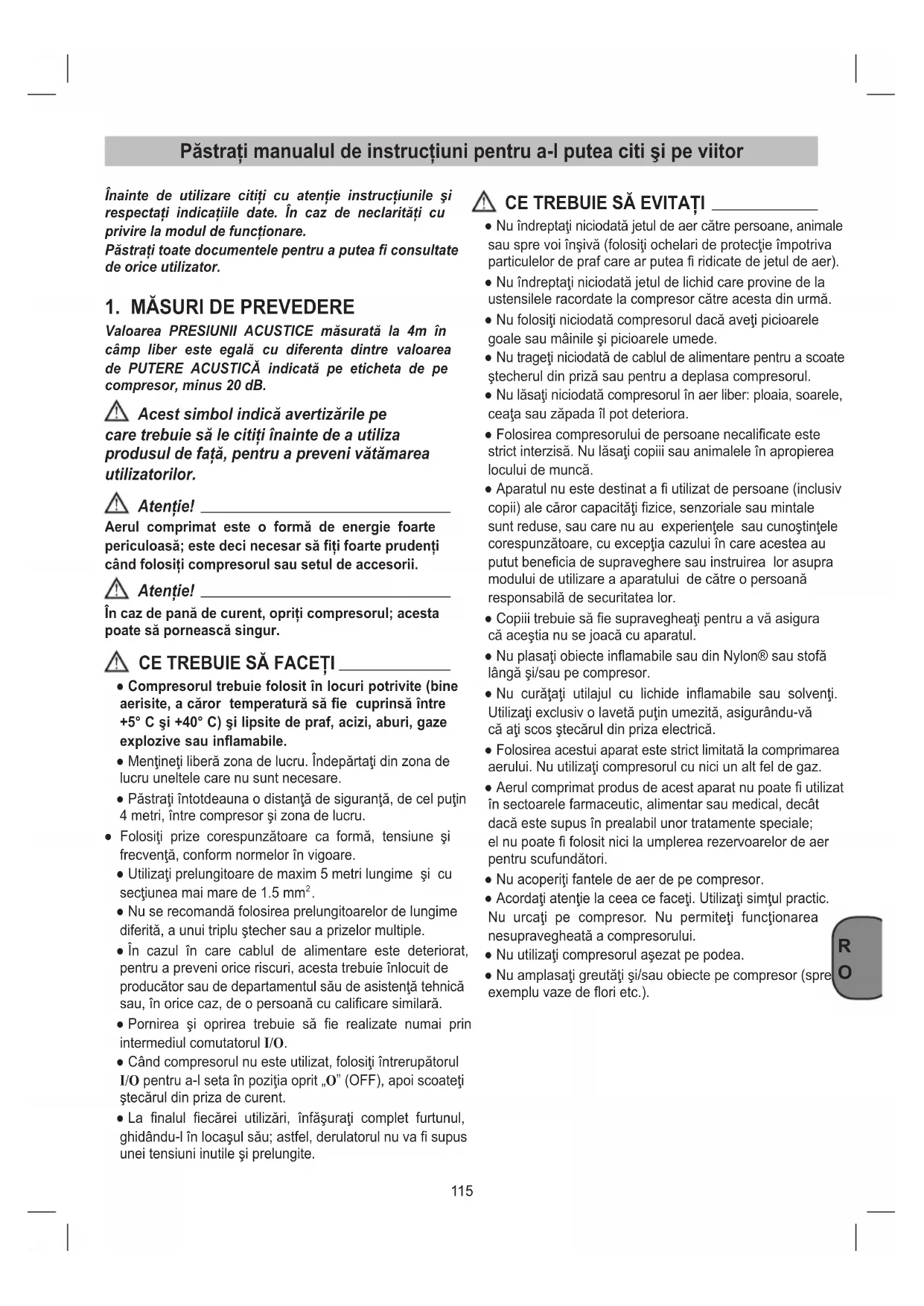 Valoarea PRESIUNII ACUSTICE măsurată la 4m în câmp liber este egală cu diferenta dintre valoarea de PUTERE ACUSTICĂ indicată pe eticheta de pe compresor, minus 20 dB. Acest simbol indică avertizările pe care trebuie să le citiţi înainte de a utiliza produsul de faţă, pentru a preveni vătămarea utilizatorilor. Atenţie! Aerul comprimat este o formă de energie foarte periculoasă; este deci necesar să ţi foarte prudenţi când folosiţi compresorul sau setul de accesorii. Atenţie! În caz de pană de curent, opriţi compresorul; acesta poate să pornească singur.