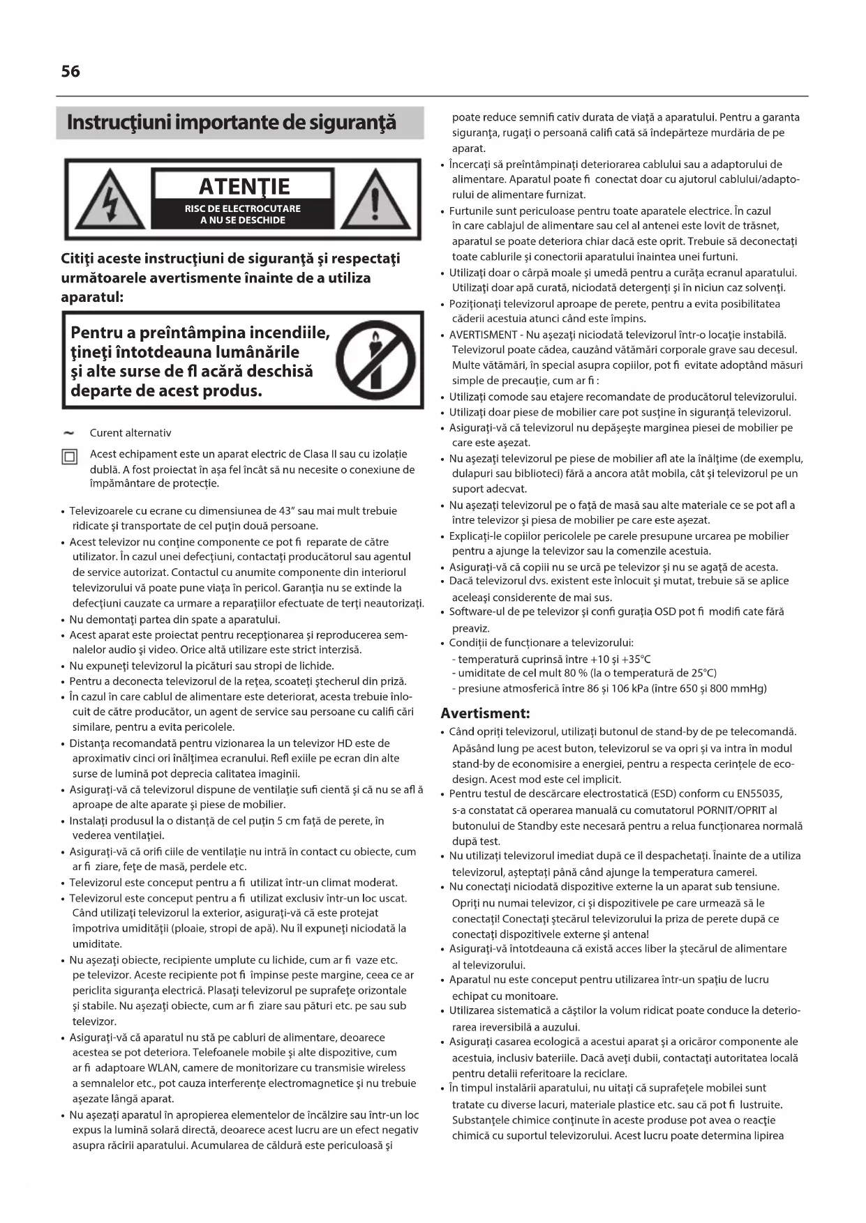 Citiţi aceste instrucţiuni de siguranţă şi respectaţi următoarele avertismente înainte de autiliza aparatul: Pentru a preîntâmpina incendiile, ţineţi întotdeauna lumânările şi alte surse de acără deschisă departe de acest produs. Curent alternativAcest echipament este un aparat electric de Clasa II sau cu izolație dublă. A fost proiectat în așa fel încât să nu necesite o conexiune de împământare de protecție.• Televizoarele cu ecrane cu dimensiunea de 43” sau mai mult trebuie ridicate şi transportate de cel puţin două persoane.• Acest televizor nu conţine componente ce pot reparate de către utilizator. În cazul unei defecţiuni, contactaţi producătorul sau agentul de service autorizat. Contactul cu anumite componente din interiorul televizorului vă poate pune viaţa în pericol. Garanţia nu se extinde la defecţiuni cauzate ca urmare areparaţiilor efectuate de terţi neautorizaţi.• Nu demontaţi partea din spate aaparatului.• Acest aparat este proiectat pentru recepţionarea şi reproducerea sem-nalelor audio şi video. Orice altă utilizare este strict interzisă.• Nu expuneţi televizorul la picături sau stropi de lichide.• Pentru a deconecta televizorul de la reţea, scoateţi ştecherul din priză.• În cazul în care cablul de alimentare este deteriorat, acesta trebuie înlo-cuit de către producător, un agent de service sau persoane cu cali cări similare, pentru aevita pericolele.• Distanţa recomandată pentru vizionarea la un televizor HD este de aproximativ cinci ori înălţimea ecranului. Re exiile pe ecran din alte surse de lumină pot deprecia calitatea imaginii.• Asiguraţi-vă că televizorul dispune de ventilaţie su cientă şi că nu se a ă aproape de alte aparate şi piese de mobilier.• Instalaţi produsul la odistanţă de cel puţin 5 cm faţă de perete, în vederea ventilaţiei.• Asiguraţi-vă că ori ciile de ventilaţie nu intră în contact cu obiecte, cum ar ziare, feţe de masă, perdele etc.• Televizorul este conceput pentru a utilizat într-un climat moderat.• Televizorul este conceput pentru a utilizat exclusiv într-un loc uscat. Când utilizaţi televizorul la exterior, asiguraţi-vă că este protejat împotriva umidităţii (ploaie, stropi de apă). Nu îl expuneţi niciodată la umiditate.• Nu aşezaţi obiecte, recipiente umplute cu lichide, cum ar vaze etc. pe televizor. Aceste recipiente pot împinse peste margine, ceea ce ar periclita siguranţa electrică. Plasaţi televizorul pe suprafeţe orizontale şi stabile. Nu aşezaţi obiecte, cum ar ziare sau pături etc. pe sau sub televizor.• Asiguraţi-vă că aparatul nu stă pe cabluri de alimentare, deoarece acestea se pot deteriora. Telefoanele mobile şi alte dispozitive, cum ar adaptoare WLAN, camere de monitorizare cu transmisie wireless asemnalelor etc., pot cauza interferenţe electromagnetice şi nu trebuie aşezate lângă aparat.• Nu aşezaţi aparatul în apropierea elementelor de încălzire sau într-un loc expus la lumină solară directă, deoarece acest lucru are un efect negativ asupra răcirii aparatului. Acumularea de căldură este periculoasă şi poate reduce semni cativ durata de viaţă aaparatului. Pentru agaranta siguranţa, rugaţi opersoană cali cată să îndepărteze murdăria de pe aparat.• Încercaţi să preîntâmpinaţi deteriorarea cablului sau aadaptorului de alimentare. Aparatul poate conectat doar cu ajutorul cablului/adapto-rului de alimentare furnizat.• Furtunile sunt periculoase pentru toate aparatele electrice. În cazul în care cablajul de alimentare sau cel al antenei este lovit de trăsnet, aparatul se poate deteriora chiar dacă este oprit. Trebuie să deconectaţi toate cablurile şi conectorii aparatului înaintea unei furtuni.• Utilizaţi doar ocârpă moale şi umedă pentru acurăţa ecranul aparatului. Utilizaţi doar apă curată, niciodată detergenţi şi în niciun caz solvenţi.• Poziţionaţi televizorul aproape de perete, pentru aevita posibilitatea căderii acestuia atunci când este împins.• AVERTISMENT - Nu aşezaţi niciodată televizorul într-o locaţie instabilă. Televizorul poate cădea, cauzând vătămări corporale grave sau decesul. Multe vătămări, în special asupra copiilor, pot evitate adoptând măsuri simple de precauţie, cum ar :• Utilizaţi comode sau etajere recomandate de producătorul televizorului.• Utilizaţi doar piese de mobilier care pot susţine în siguranţă televizorul.• Asiguraţi-vă că televizorul nu depăşeşte marginea piesei de mobilier pe care este aşezat.• Nu aşezaţi televizorul pe piese de mobilier a ate la înălţime (de exemplu, dulapuri sau biblioteci) fără a ancora atât mobila, cât şi televizorul pe un suport adecvat.• Nu aşezaţi televizorul pe o faţă de masă sau alte materiale ce se pot a a între televizor şi piesa de mobilier pe care este aşezat.• Explicaţi-le copiilor pericolele pe carele presupune urcarea pe mobilier pentru a ajunge la televizor sau la comenzile acestuia.• Asiguraţi-vă că copiii nu se urcă pe televizor şi nu se agaţă de acesta.• Dacă televizorul dvs. existent este înlocuit şi mutat, trebuie să se aplice aceleaşi considerente de mai sus.• Software-ul de pe televizor şi con guraţia OSD pot modi cate fără preaviz.• Condiții de funcționare a televizorului:- temperatură cuprinsă între +10 și +35°C- umiditate de cel mult 80% (la o temperatură de 25°C)- presiune atmosferică între 86 și 106 kPa (între 650 și 800 mmHg) Avertisment: