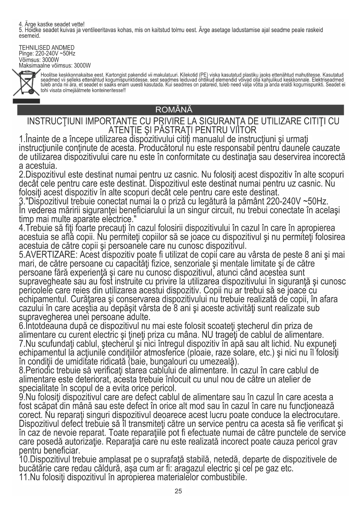 5. Depozitați dispozitivul într-un loc uscat și aerisit, ferit de praf. Nu așezați obiecte grele pe partea de sus a dispozitivului în timpul depozitării. DATE TEHNICE Tensiune: 220-240V ~50Hz Putere: 3000W Putere maxima: 3000W Din grija pentru mediul înconjurător. Ambalajele din carton vă rugăm să le transmiteţi şa centrele de maculatură.Sacii din polietilenă (PE) trebuie aruncate în recipientele pentru materialele plastice. Dispozitivul uzat trebuie transmis la punctul corespunzător de depozitare, deoarece componentele periculoase care se găsesc în dispozitiv pot fi foarte periculoase pentru mediul înconjurător. Dispozitivul electric trebuie transmis în aşa fel încât să se limiteze utilizarea lui repetată. Dacă în dispozitiv se găsesc baterii acestea trebuiesc scoase şi transmise către punctul de depozitare a acestora, separat. BOSANSKI OPŠTI USLOVI BEZBJEDNOSTI. VAŽNE UPUTE KOJE SE TIČU BEZBJEDNOSTI UPOTREBE. PROČITAJTE IH PAŽLJIVO I SAČUTOVAJTE KAKO BISTE IH