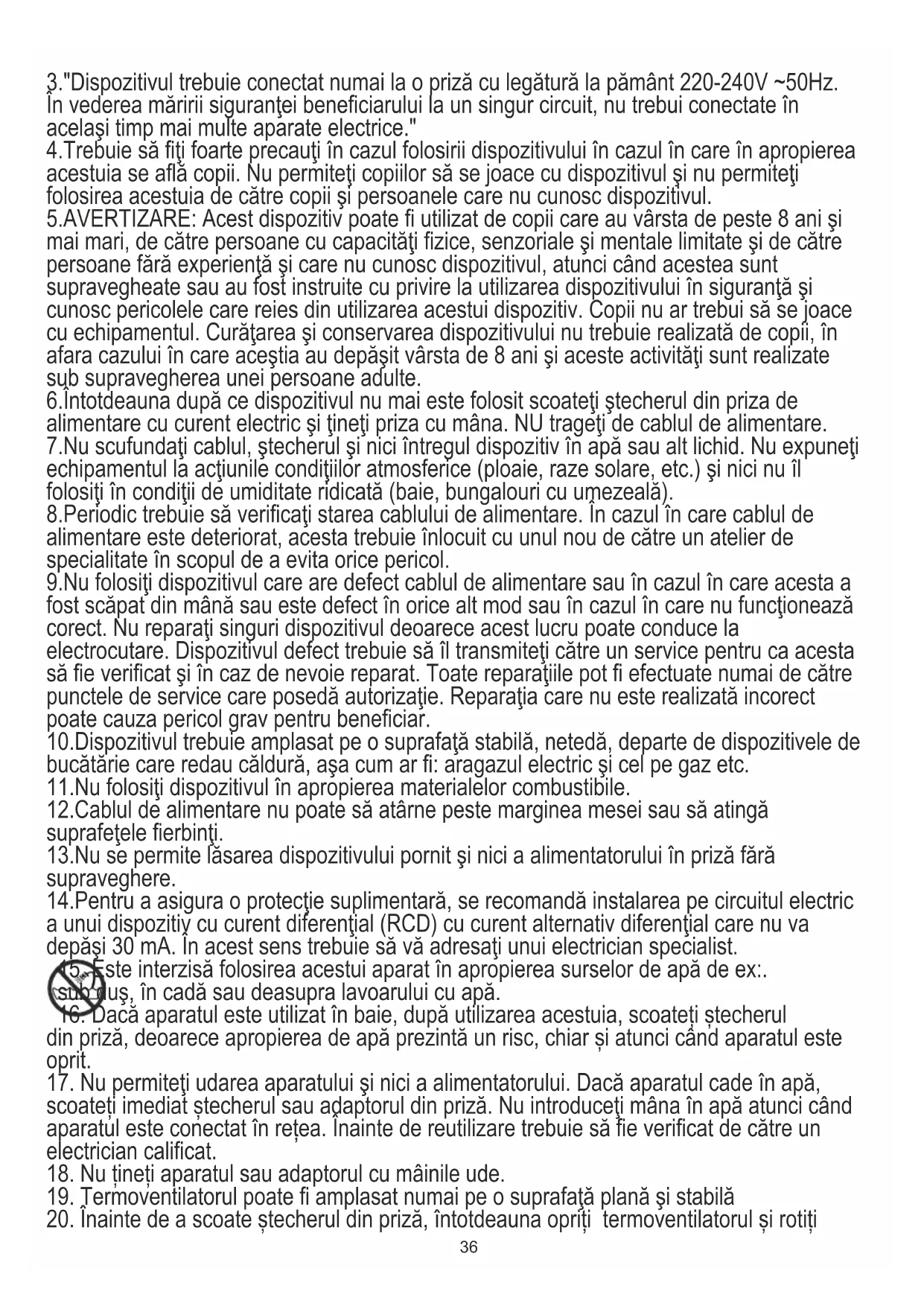 21. Nu folosiți termoventilatorul în încăperi cu umiditate ridicată - băi, duşuri, piscine, etc.