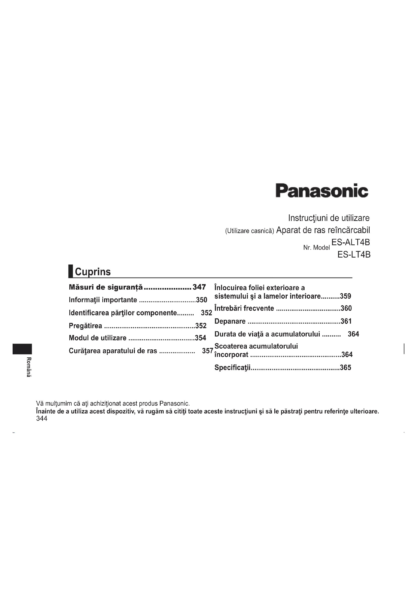 - ES‑LT4B Vă mulţumim că aţi achiziţionat acest produs Panasonic. Înaintedeautilizaacestdispozitiv,vărugămsăcitiţitoateacesteinstrucţiunişisălepăstraţipentrureferinţeulterioare. Măsuri de siguranţă p. 347