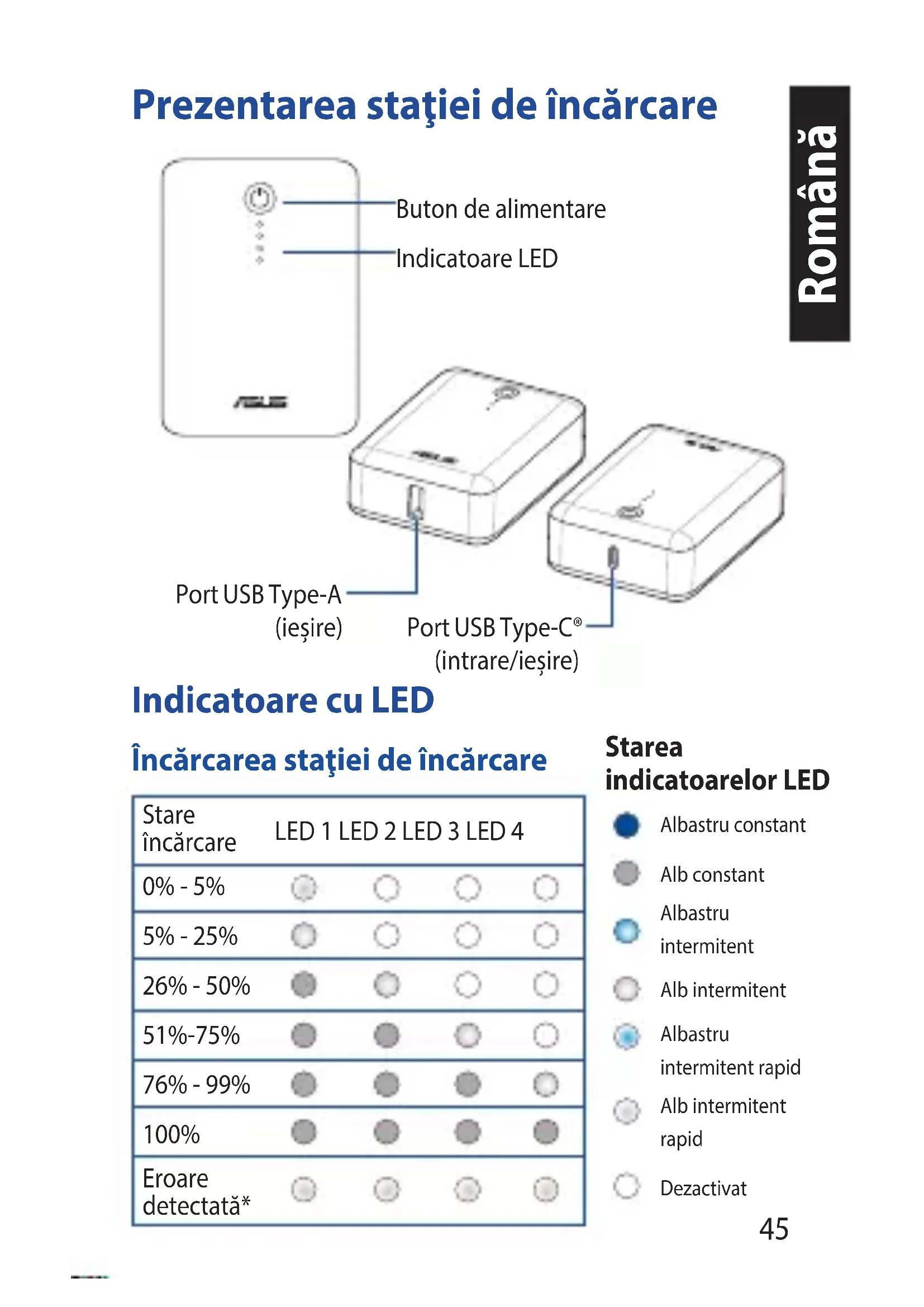 - Não utilize o carregador em ambientes com temperaturas superiores a 40ºC (104ºF), nem o exponha a água ou fogo, nem tente quebrar a caixa.45 Română Prezentarea staţiei de încărcare Încărcarea staţiei de încărcare Indicatoare cu LED Indicatoare LEDButon de alimentarePort USB Type-A (ieșire)Port USB Type-C® (intrare/ieșire) Starea indicatoarelor LED Stare încărcareLED 1 LED 2 LED 3 LED 40% - 5%5% - 25% 26% - 50%51%-75%76% - 99% 100% Eroare detectată*Albastru constantAlb constantAlbastru intermitentAlb intermitentAlbastru intermitent rapidAlb intermitent rapidDezactivat46 Română Încărcarea dispozitivelor utilizând staţia de încărcare Stare descărcare