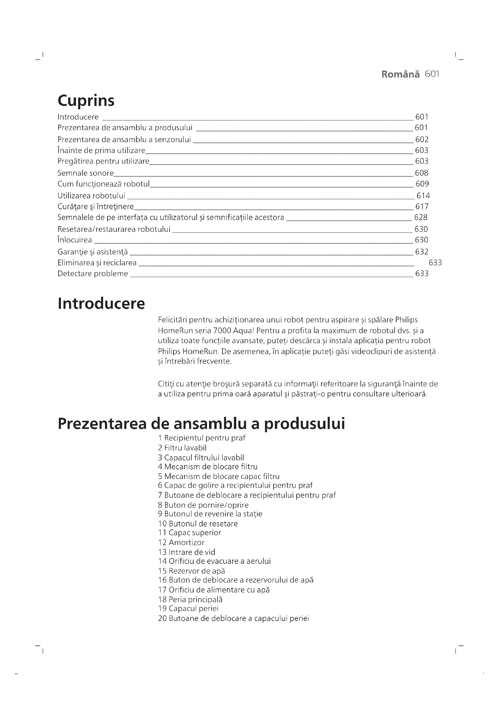 Română Cuprins Introducere _______________________________________________________________________________ 601 Prezentarea de ansamblu a produsului _______________________________________________________ 601 Prezentarea de ansamblu a senzorului ________________________________________________________ 602 Înainte de prima utilizare____________________________________________________________________ 603 Pregătirea pentru utilizare___________________________________________________________________ 603 Semnale sonore____________________________________________________________________________ 608 Cum funcţionează robotul___________________________________________________________________ 609 Utilizarea robotului _________________________________________________________________________ 614 Curăţare şi întreţinere_______________________________________________________________________ 617 Semnalele de pe interfața cu utilizatorul și semnificațiile acestora ________________________________ 628 Resetarea/restaurarea robotului _____________________________________________________________ 630 Înlocuirea _________________________________________________________________________________ 630 Garanţie şi asistenţă ________________________________________________________________________ 632 Eliminarea și reciclarea ______________________________________________________________________ 633 Detectare probleme ________________________________________________________________________ 633 Introducere Felicitări pentru achiziționarea unui robot pentru aspirare și spălare Philips HomeRun seria 7000 Aqua! Pentru a profita la maximum de robotul dvs. și a utiliza toate funcțiile avansate, puteți descărca și instala aplicația pentru robot Philips HomeRun. De asemenea, în aplicație puteți găsi videoclipuri de asistență și întrebări frecvente. Citiţi cu atenţie broşură separată cu informaţii referitoare la siguranţă înainte de a utiliza pentru prima oară aparatul şi păstraţi-o pentru consultare ulterioară. Prezentarea de ansamblu a produsului 1 Recipientul pentru praf 2 Filtru lavabil 3 Capacul filtrului lavabil 4 Mecanism de blocare filtru 5 Mecanism de blocare capac filtru 6 Capac de golire a recipientului pentru praf 7 Butoane de deblocare a recipientului pentru praf 8 Buton de pornire/oprire 9 Butonul de revenire la stație 10 Butonul de resetare 11 Capac superior 12 Amortizor 13 Intrare de vid 14 Orificiu de evacuare a aerului 15 Rezervor de apă 16 Buton de deblocare a rezervorului de apă 17 Orificiu de alimentare cu apă 18 Peria principală 19 Capacul periei 20 Butoane de deblocare a capacului periei602 Română 21 Roțile principale 22 Roată față 23 Puncte de contact pentru încărcare (robot) 24 Perie laterală 25 Suportul lavetei de curățare 26 Lavetă de curățare lavabilă (2x) 27 Cablu de alimentare (XU7000) 28 Stație (de încărcare) (XU7000) 29 Fereastra semnalului IR (XU7000) 30 Puncte de contact pentru încărcare (stație) 31 Mufă pentru cablul de alimentare 32 Covoraș amplasare (XU7000) 33 Sac de praf (2x) (XU7100) 34 Capacul stației 35 Compartimentul sacului de praf 36 Stație de golire automată (XU7100) 37 LED indicator 38 Fereastra semnalului IR 39 Rampă 40 Fantă pentru golire automată 41 Orificiu de evacuare a aerului pentru golire automată 42 Puncte de contact pentru încărcare (stație) 43 Orificiu de evacuare a aerului 44 Accesoriu de curățat peria 45 Mufă pentru cablul de alimentare 46 Cablu de alimentare (XU7100) Prezentarea de ansamblu a senzorului