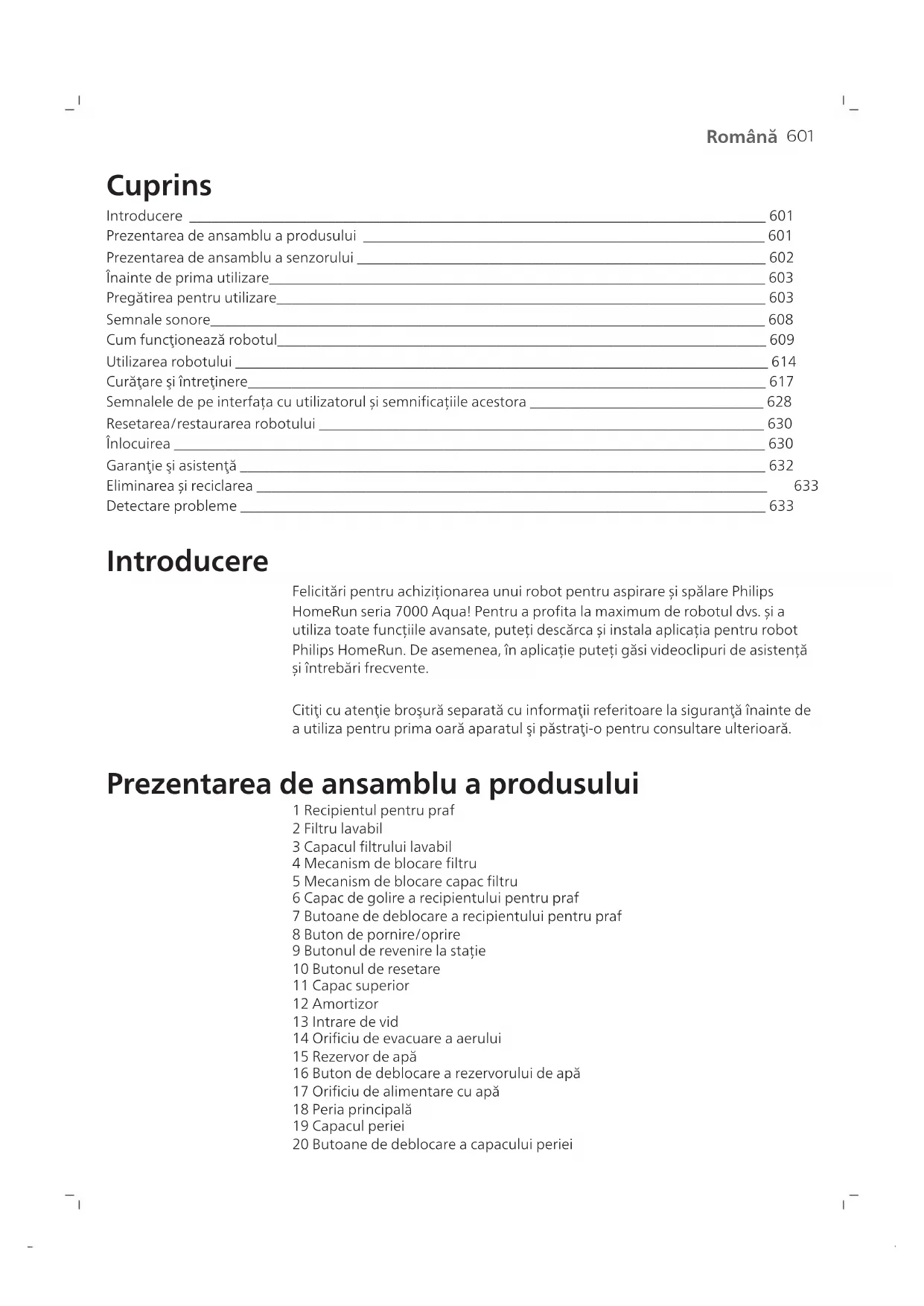 Română Cuprins Introducere _______________________________________________________________________________ 601 Prezentarea de ansamblu a produsului _______________________________________________________ 601 Prezentarea de ansamblu a senzorului ________________________________________________________ 602 Înainte de prima utilizare____________________________________________________________________ 603 Pregătirea pentru utilizare___________________________________________________________________ 603 Semnale sonore____________________________________________________________________________ 608 Cum funcţionează robotul___________________________________________________________________ 609 Utilizarea robotului _________________________________________________________________________ 614 Curăţare şi întreţinere_______________________________________________________________________ 617 Semnalele de pe interfața cu utilizatorul și semnificațiile acestora ________________________________ 628 Resetarea/restaurarea robotului _____________________________________________________________ 630 Înlocuirea _________________________________________________________________________________ 630 Garanţie şi asistenţă ________________________________________________________________________ 632 Eliminarea și reciclarea ______________________________________________________________________ 633 Detectare probleme ________________________________________________________________________ 633 Introducere Felicitări pentru achiziționarea unui robot pentru aspirare și spălare Philips HomeRun seria 7000 Aqua! Pentru a profita la maximum de robotul dvs. și a utiliza toate funcțiile avansate, puteți descărca și instala aplicația pentru robot Philips HomeRun. De asemenea, în aplicație puteți găsi videoclipuri de asistență și întrebări frecvente. Citiţi cu atenţie broşură separată cu informaţii referitoare la siguranţă înainte de a utiliza pentru prima oară aparatul şi păstraţi-o pentru consultare ulterioară. Prezentarea de ansamblu a produsului 1 Recipientul pentru praf 2 Filtru lavabil 3 Capacul filtrului lavabil 4 Mecanism de blocare filtru 5 Mecanism de blocare capac filtru 6 Capac de golire a recipientului pentru praf 7 Butoane de deblocare a recipientului pentru praf 8 Buton de pornire/oprire 9 Butonul de revenire la stație 10 Butonul de resetare 11 Capac superior 12 Amortizor 13 Intrare de vid 14 Orificiu de evacuare a aerului 15 Rezervor de apă 16 Buton de deblocare a rezervorului de apă 17 Orificiu de alimentare cu apă 18 Peria principală 19 Capacul periei 20 Butoane de deblocare a capacului periei602 Română 21 Roțile principale 22 Roată față 23 Puncte de contact pentru încărcare (robot) 24 Perie laterală 25 Suportul lavetei de curățare 26 Lavetă de curățare lavabilă (2x) 27 Cablu de alimentare (XU7000) 28 Stație (de încărcare) (XU7000) 29 Fereastra semnalului IR (XU7000) 30 Puncte de contact pentru încărcare (stație) 31 Mufă pentru cablul de alimentare 32 Covoraș amplasare (XU7000) 33 Sac de praf (2x) (XU7100) 34 Capacul stației 35 Compartimentul sacului de praf 36 Stație de golire automată (XU7100) 37 LED indicator 38 Fereastra semnalului IR 39 Rampă 40 Fantă pentru golire automată 41 Orificiu de evacuare a aerului pentru golire automată 42 Puncte de contact pentru încărcare (stație) 43 Orificiu de evacuare a aerului 44 Accesoriu de curățat peria 45 Mufă pentru cablul de alimentare 46 Cablu de alimentare (XU7100) Prezentarea de ansamblu a senzorului