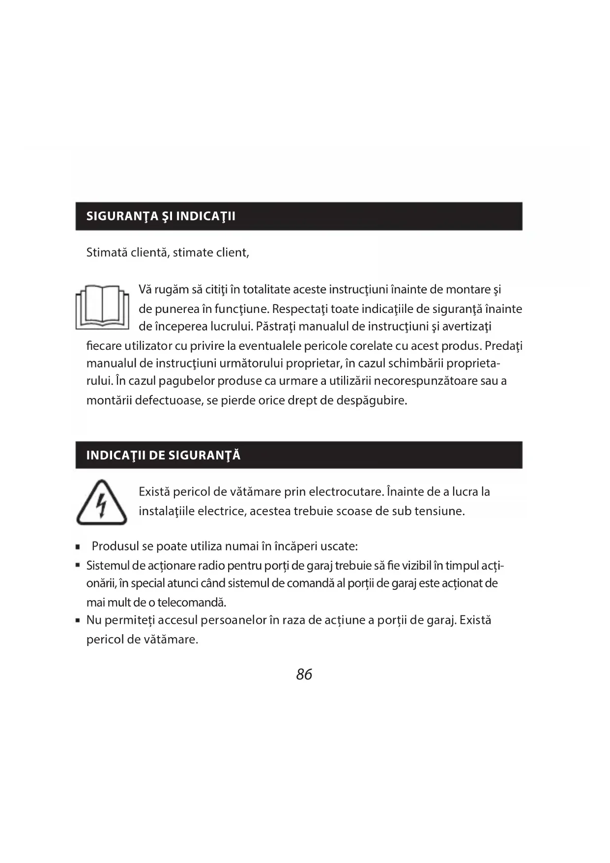 Există pericol de vătămare prin electrocutare Înainte de a lucra la instalaţiile electrice, acestea trebuie scoase de sub tensiune Produsul se poate utiliza numai în încăperi uscate: Sistemul de acționare radio pentru porți de garaj trebuie să e vizibil în timpul acți- onării, în special atunci când sistemul de comandă al porții de garaj este acționat de mai mult de o telecomandă Nu permiteți accesul persoanelor în raza de acțiune a porții de garaj Există pericol de vătămare