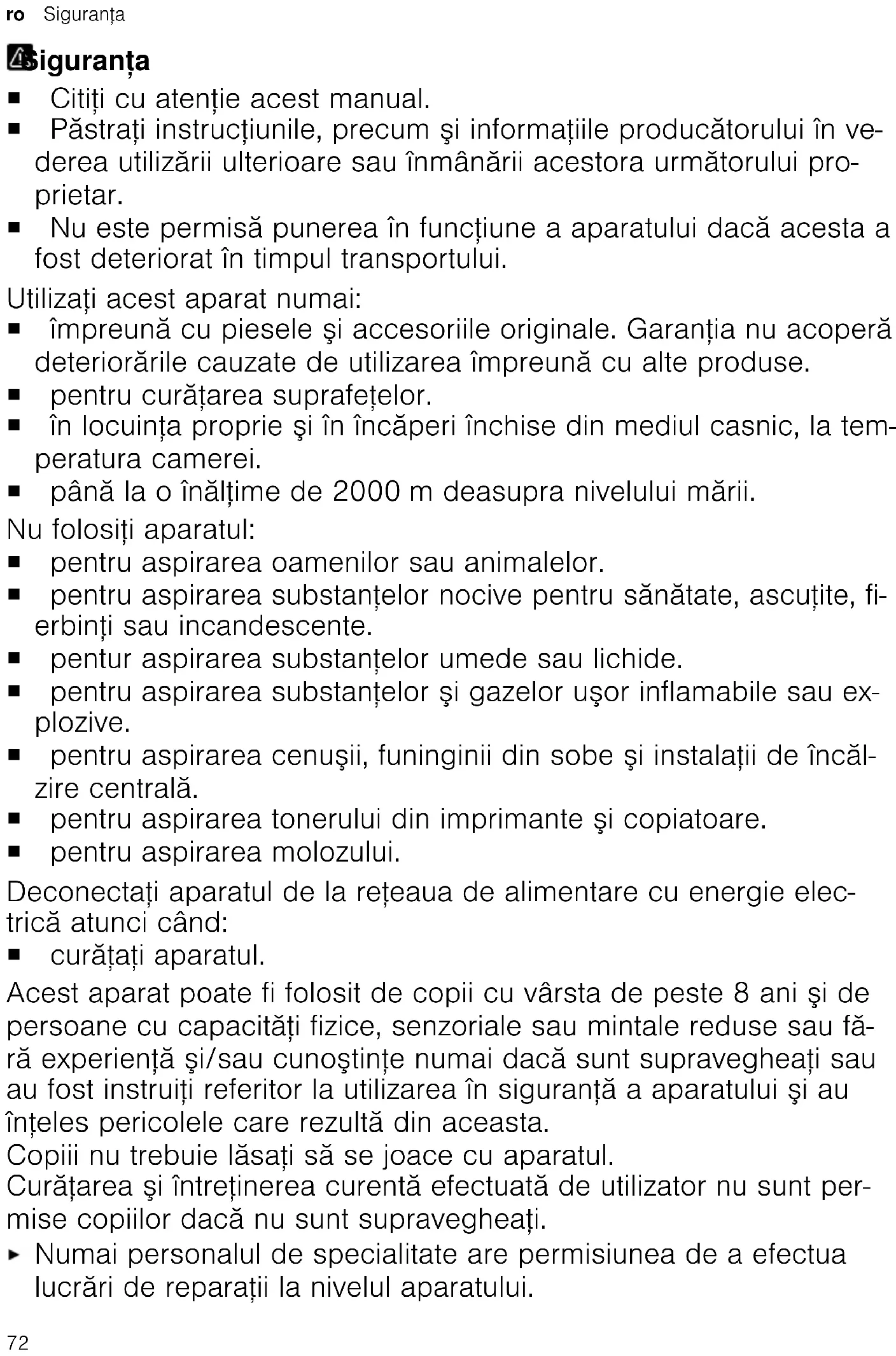 За почистването на твърди подове из- ползвайте предназначената за почист- ването на твърди подове и изпитвател- ния процеп дюза за твърди подове, ако е включена в комплекта. Данните за мощността на този уред се основават на методите за измерване и изчисляване съгласно Регламент (ЕС) № 666/2013 и стандартите EN 60312-1, EN 60704-2-1, EN 60335-2-2. 71ro Siguranţa Siguranţa Siguranţa ¡ Citiţi cu atenţie acest manual. ¡ Păstraţi instrucţiunile, precum şi informaţiile producătorului în ve- derea utilizării ulterioare sau înmânării acestora următorului pro- prietar. ¡ Nu este permisă punerea în funcţiune a aparatului dacă acesta a fost deteriorat în timpul transportului. Utilizaţi acest aparat numai: ¡ împreună cu piesele şi accesoriile originale. Garanţia nu acoperă deteriorările cauzate de utilizarea împreună cu alte produse. ¡ pentru curăţarea suprafeţelor. ¡ în locuinţa proprie şi în încăperi închise din mediul casnic, la tem- peratura camerei. ¡ până la o înălţime de 2000m deasupra nivelului mării. Nu folosiţi aparatul: ¡ pentru aspirarea oamenilor sau animalelor. ¡ pentru aspirarea substanţelor nocive pentru sănătate, ascuţite, fi- erbinţi sau incandescente. ¡ pentur aspirarea substanţelor umede sau lichide. ¡ pentru aspirarea substanţelor şi gazelor uşor inflamabile sau ex- plozive. ¡ pentru aspirarea cenuşii, funinginii din sobe şi instalaţii de încăl- zire centrală. ¡ pentru aspirarea tonerului din imprimante şi copiatoare. ¡ pentru aspirarea molozului. Deconectaţi aparatul de la reţeaua de alimentare cu energie elec- trică atunci când: ¡ curăţaţi aparatul. Acest aparat poate fi folosit de copii cu vârsta de peste 8 ani şi de persoane cu capacităţi fizice, senzoriale sau mintale reduse sau fă- ră experienţă şi/sau cunoştinţe numai dacă sunt supravegheaţi sau au fost instruiţi referitor la utilizarea în siguranţă a aparatului şi au înţeles pericolele care rezultă din aceasta. Copiii nu trebuie lăsaţi să se joace cu aparatul. Curăţarea şi întreţinerea curentă efectuată de utilizator nu sunt per- mise copiilor dacă nu sunt supravegheaţi. Numai personalul de specialitate are permisiunea de a efectua lucrări de reparaţii la nivelul aparatului. 72Siguranţa ro La reparaţia aparatului trebuie utilizate numai piese de schimb originale. Dacă se deteriorează cablul de racordare la reţea al acestui apa- rat, acesta trebuie înlocuit de către producător, de către serviciul său pentru clienţi sau de către o persoană calificată în mod simi- lar, pentru a evita pericolele. Nu utilizaţi niciodată un aparat deteriorat. Nu utilizaţi un aparat care are suprafaţa cu fisuri sau spartă. Nu trageţi niciodată de cablul de alimentare electrică pentru a deconecta aparatul de la reţeaua de alimentare electrică. Scoa- teţi întotdeauna din priză ştecherul cablului de alimentare electri- că. Nu trageţi niciodată de cablul de alimentare electrică al aparatu- lui şi nu sprijiniţi aparatul pe acesta. Dacă aparatul sau cablul de alimentare electrică este deteriorat, scoateţi imediat ştecherul din priză sau decuplaţi siguranţa din cutia cu siguranţe. Contactaţi unitatea de service abilitată.