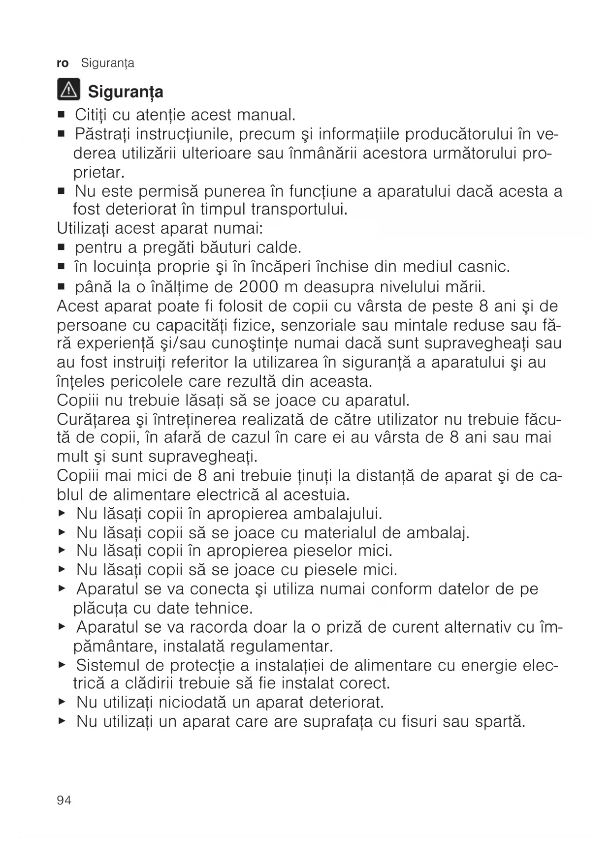 Siguranţa ¡ Citiţi cu atenţie acest manual. ¡ Păstraţi instrucţiunile, precum şi informaţiile producătorului în ve- derea utilizării ulterioare sau înmânării acestora următorului pro- prietar. ¡ Nu este permisă punerea în funcţiune a aparatului dacă acesta a fost deteriorat în timpul transportului. Utilizaţi acest aparat numai: ¡ pentru a pregăti băuturi calde. ¡ în locuinţa proprie şi în încăperi închise din mediul casnic. ¡ până la o înălţime de 2000m deasupra nivelului mării. Acest aparat poate fi folosit de copii cu vârsta de peste 8 ani şi de persoane cu capacităţi fizice, senzoriale sau mintale reduse sau fă- ră experienţă şi/sau cunoştinţe numai dacă sunt supravegheaţi sau au fost instruiţi referitor la utilizarea în siguranţă a aparatului şi au înţeles pericolele care rezultă din aceasta. Copiii nu trebuie lăsaţi să se joace cu aparatul. Curăţarea şi întreţinerea realizată de către utilizator nu trebuie făcu- tă de copii, în afară de cazul în care ei au vârsta de 8 ani sau mai mult şi sunt supravegheaţi. Copiii mai mici de 8 ani trebuie ţinuţi la distanţă de aparat şi de ca- blul de alimentare electrică al acestuia. ▶ Nu lăsaţi copii în apropierea ambalajului. ▶ Nu lăsaţi copii să se joace cu materialul de ambalaj. ▶ Nu lăsaţi copii în apropierea pieselor mici. ▶ Nu lăsaţi copii să se joace cu piesele mici. ▶ Aparatul se va conecta şi utiliza numai conform datelor de pe plăcuţa cu date tehnice. ▶ Aparatul se va racorda doar la o priză de curent alternativ cu îm- pământare, instalată regulamentar. ▶ Sistemul de protecţie a instalaţiei de alimentare cu energie elec- trică a clădirii trebuie să fie instalat corect. ▶ Nu utilizaţi niciodată un aparat deteriorat. ▶ Nu utilizaţi un aparat care are suprafaţa cu fisuri sau spartă.Siguranţa ro Tipărit pe hârtie reciclabilă 100% 95 ▶ Nu trageţi niciodată de cablul de alimentare electrică pentru a deconecta aparatul de la reţeaua de alimentare electrică. Scoa- teţi întotdeauna din priză ştecherul cablului de alimentare electri- că. ▶ Dacă aparatul sau cablul de alimentare electrică este deteriorat, scoateţi imediat ştecherul din priză sau decuplaţi siguranţa din cutia cu siguranţe. ▶ Contactaţi unitatea de service abilitată. ▶ Numai personalul de specialitate are permisiunea de a efectua lucrări de reparaţii la nivelul aparatului. ▶ La reparaţia aparatului trebuie utilizate numai piese de schimb originale. ▶ Dacă se deteriorează cablul de racordare la reţea al acestui apa- rat, acesta trebuie înlocuit de către producător, de către serviciul său pentru clienţi sau de către o persoană calificată în mod simi- lar, pentru a evita pericolele. ▶ Nu cufundaţi niciodată aparatul sau cablul de alimentare de la reţea în apă. ▶ Conectorul aparatului nu trebuie să intre în contact cu lichide. ▶ Utilizaţi aparatul numai în spaţii închise. ▶ Nu expuneţi niciodată aparatul la căldură şi umiditate excesive. ▶ Nu utilizaţi pentru curăţarea aparatului aparate de curăţat cu jet sub presiune sau cu jet de abur. ▶ Ventilaţi suficient aparatul. ▶ Să nu utilizaţi niciodată aparatul într-un dulap. ▶ Supravegheaţi mereu aparatul în timpul funcţionării. ▶ Nu utilizaţi prelungitoare sau prize multiple. ▶ În cazul în care cablul de alimentare de la reţea este prea scurt contactaţi serviciul pentru clienţi. ▶ Utilizaţi numai adaptoare care au fost avizate de producător. ▶ Să nu deschideţi niciodată sistemul de infuzare în timpul funcţio- nării. ▶ Utilizaţi numai TDISC-urile originale de la Tassimo. ▶ Să nu utilizaţi niciodată un T DISC deteriorat. ▶ Să nu utilizaţi niciodată o băutură de la un T DISC de mai multe ori. ▶ Să nu atingeţi niciodată piesele înfierbântate ale aparatului.ro Vedere de ansamblu 96 Tipărit pe hârtie reciclabilă 100% ▶ După utilizare lăsaţi piesele înfierbântate ale aparatului să se ră- cească înainte de a le atinge. ▶ Dacă este necesar, lăsaţi băuturile să se răcească. ▶ Evitaţi contactul pielii cu lichidele şi aburii evacuaţi. ▶ Pentru a evita vătămări corporale utilizaţi aparatul exclusiv con- form destinaţiei prevăzute. ▶ Aveţi grijă când introduceţi T DISC-ul sau la curăţare să nu vă tăi- aţi la degete. ▶ Persoanele cu implanturi electronice trebuie să păstreze o dis- tanţă de minimum 10cm faţă de aparat. ▶ Respectaţi distanţa minimă de 10 mm şi cu rezervorul de apă scos. ▶ Respectaţi instrucţiunile de curăţare şi referitoare la igienă pen- tru aparat. Vedere de ansamblu Aici găsiţi o privire de ansamblu asupra componentelor aparatului dvs. Notă:În funcţie de tipul aparatului, sunt po- sibile diferenţe de culoare şi de detalii.