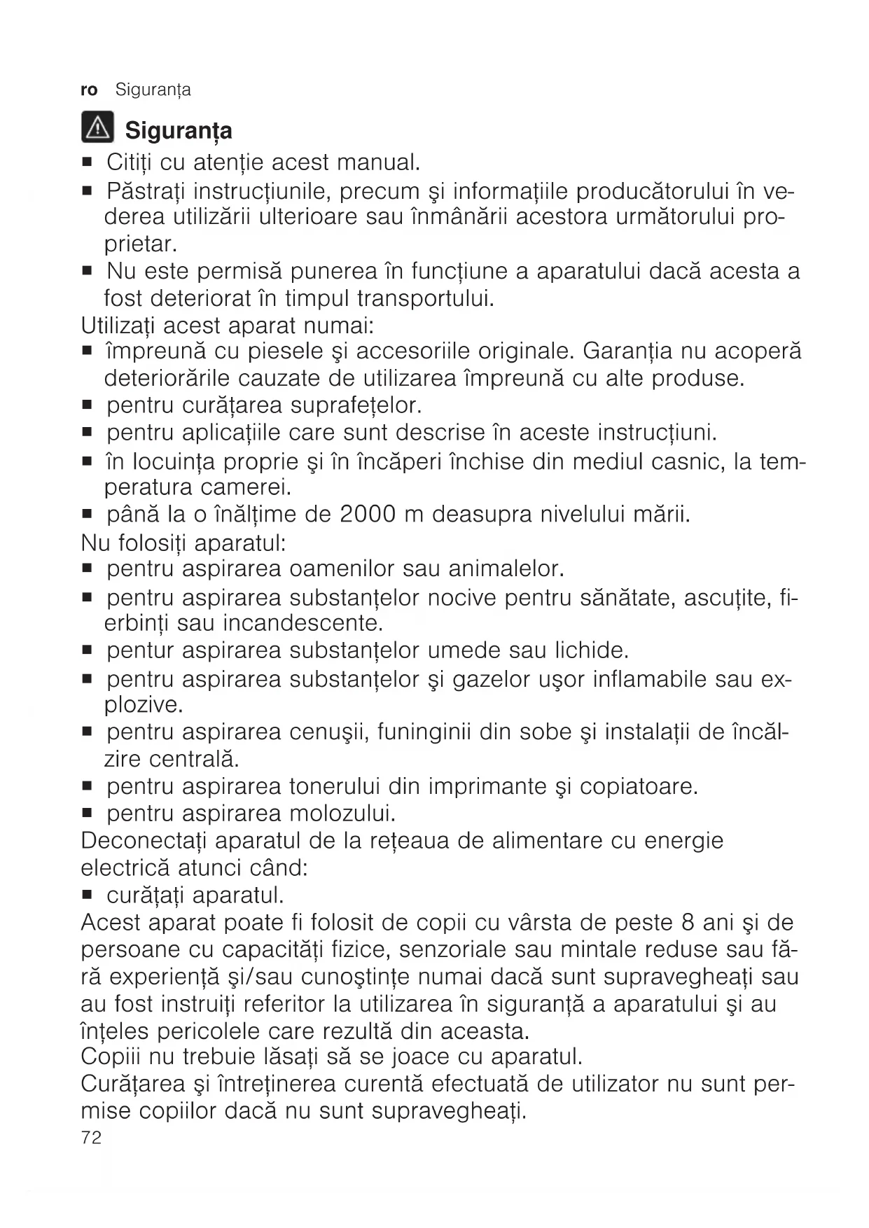 Siguranţa ¡ Citiţi cu atenţie acest manual. ¡ Păstraţi instrucţiunile, precum şi informaţiile producătorului în ve- derea utilizării ulterioare sau înmânării acestora următorului pro- prietar. ¡ Nu este permisă punerea în funcţiune a aparatului dacă acesta a fost deteriorat în timpul transportului. Utilizaţi acest aparat numai: ¡ împreună cu piesele şi accesoriile originale. Garanţia nu acoperă deteriorările cauzate de utilizarea împreună cu alte produse. ¡ pentru curăţarea suprafeţelor. ¡ pentru aplicaţiile care sunt descrise în aceste instrucţiuni. ¡ în locuinţa proprie şi în încăperi închise din mediul casnic, la tem- peratura camerei. ¡ până la o înălţime de 2000m deasupra nivelului mării. Nu folosiţi aparatul: ¡ pentru aspirarea oamenilor sau animalelor. ¡ pentru aspirarea substanţelor nocive pentru sănătate, ascuţite, fi- erbinţi sau incandescente. ¡ pentur aspirarea substanţelor umede sau lichide. ¡ pentru aspirarea substanţelor şi gazelor uşor inflamabile sau ex- plozive. ¡ pentru aspirarea cenuşii, funinginii din sobe şi instalaţii de încăl- zire centrală. ¡ pentru aspirarea tonerului din imprimante şi copiatoare. ¡ pentru aspirarea molozului. Deconectaţi aparatul de la reţeaua de alimentare cu energie electrică atunci când: ¡ curăţaţi aparatul. Acest aparat poate fi folosit de copii cu vârsta de peste 8 ani şi de persoane cu capacităţi fizice, senzoriale sau mintale reduse sau fă- ră experienţă şi/sau cunoştinţe numai dacă sunt supravegheaţi sau au fost instruiţi referitor la utilizarea în siguranţă a aparatului şi au înţeles pericolele care rezultă din aceasta. Copiii nu trebuie lăsaţi să se joace cu aparatul. Curăţarea şi întreţinerea curentă efectuată de utilizator nu sunt per- mise copiilor dacă nu sunt supravegheaţi.Siguranţa ro