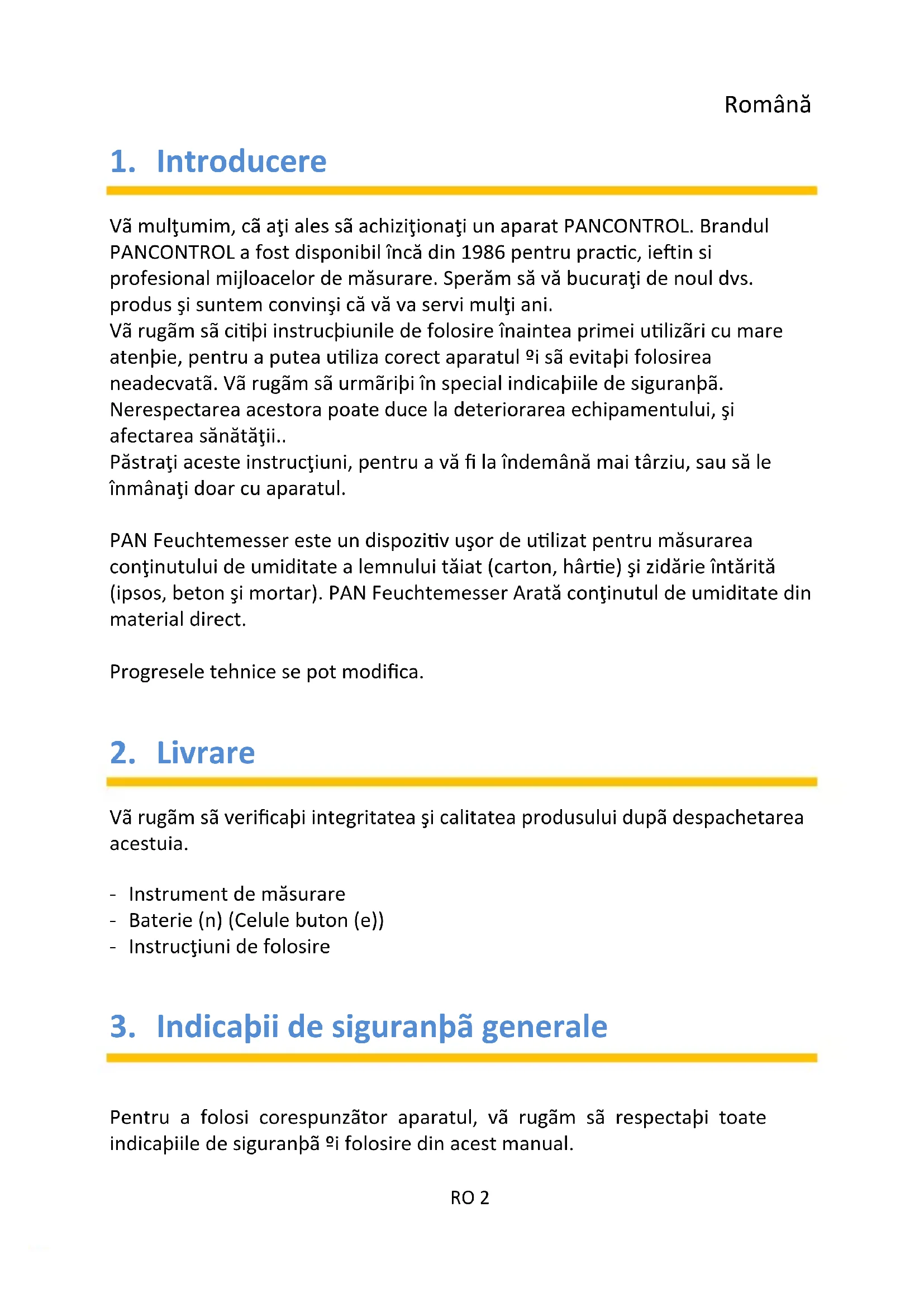 Vã mulţumim, cã aţi ales sã achiziţionaţi un aparat PANCONTROL. Brandul PANCONTROL a fost disponibil încă din 1986 pentru practic, ieftin si profesional mijloacelor de măsurare. Sperăm să vă bucuraţi de noul dvs. produs şi suntem convinşi că vă va servi mulţi ani. Vã rugãm sã citiþi instrucþiunile de folosire înaintea primei utilizãri cu mare atenþie, pentru a putea utiliza corect aparatul ºi sã evitaþi folosirea neadecvatã. Vã rugãm sã urmãriþi în special indicaþiile de siguranþã. Nerespectarea acestora poate duce la deteriorarea echipamentului, şi afectarea sănătăţii.. Păstraţi aceste instrucţiuni, pentru a vă fi la îndemână mai târziu, sau să le înmânaţi doar cu aparatul. PAN Feuchtemesser este un dispozitiv uşor de utilizat pentru măsurarea conţinutului de umiditate a lemnului tăiat (carton, hârtie) şi zidărie întărită (ipsos, beton şi mortar). PAN Feuchtemesser Arată conţinutul de umiditate din material direct. Progresele tehnice se pot modifica.