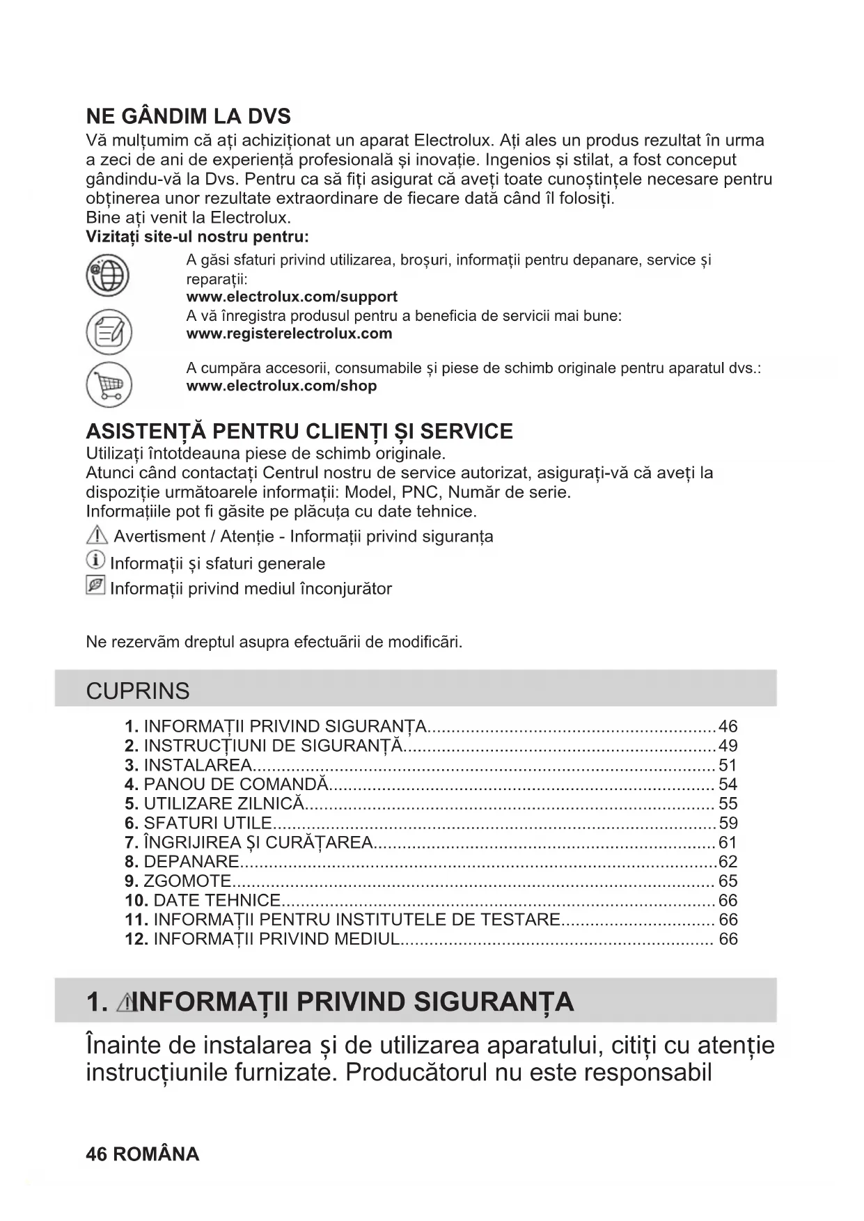 Vă mulțumim că ați achiziționat un aparat Electrolux. Aţi ales un produs rezultat în urma a zeci de ani de experienţă profesională şi inovaţie. Ingenios şi stilat, a fost conceput gândindu-vă la Dvs. Pentru ca să fiți asigurat că aveți toate cunoștințele necesare pentru obținerea unor rezultate extraordinare de fiecare dată când îl folosiți. Bine ați venit la Electrolux.Vizitați site-ul nostru pentru: A găsi sfaturi privind utilizarea, broșuri, informații pentru depanare, service și reparații:www.electrolux.com/supportA vă înregistra produsul pentru a beneficia de servicii mai bune:www.registerelectrolux.comA cumpăra accesorii, consumabile și piese de schimb originale pentru aparatul dvs.:www.electrolux.com/shop