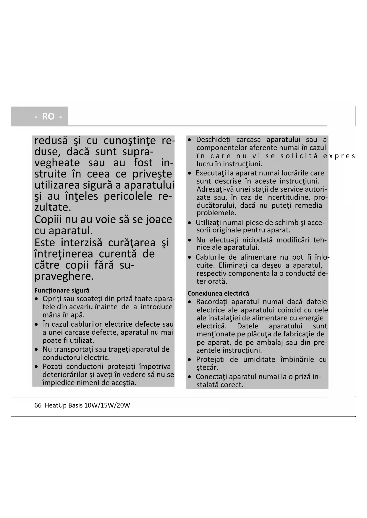Etanş la apă, până la o adâncime de 1 m. Clasa de protecţie II, izo- laţie de protecţie con- ducătoare de tensiune în caz de eroare Utilizaţi în inte- rior. Nu aruncaţi în gunoiul menajer ! Citiţi in- strucţiunile de utilizare !90 HeatUp Basis 10W/15W/20W