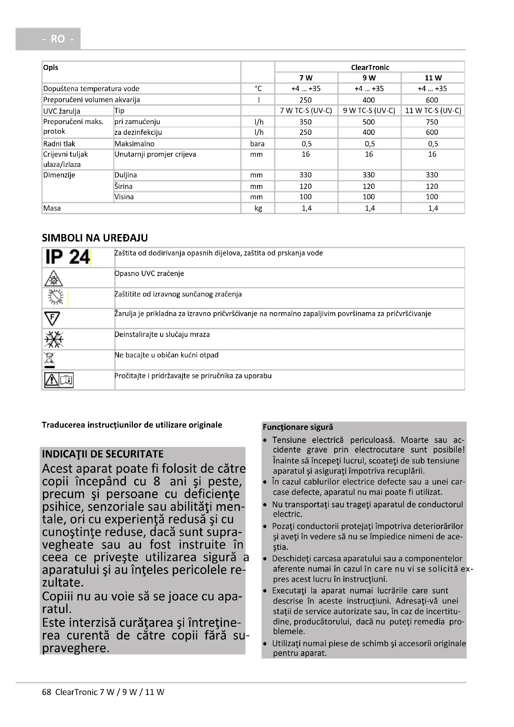 PRECAUŢIE Radiaţiile din domeniul UVC emise de lampa cu ultra- violete sunt periculoase pentru ochi sau piele.
